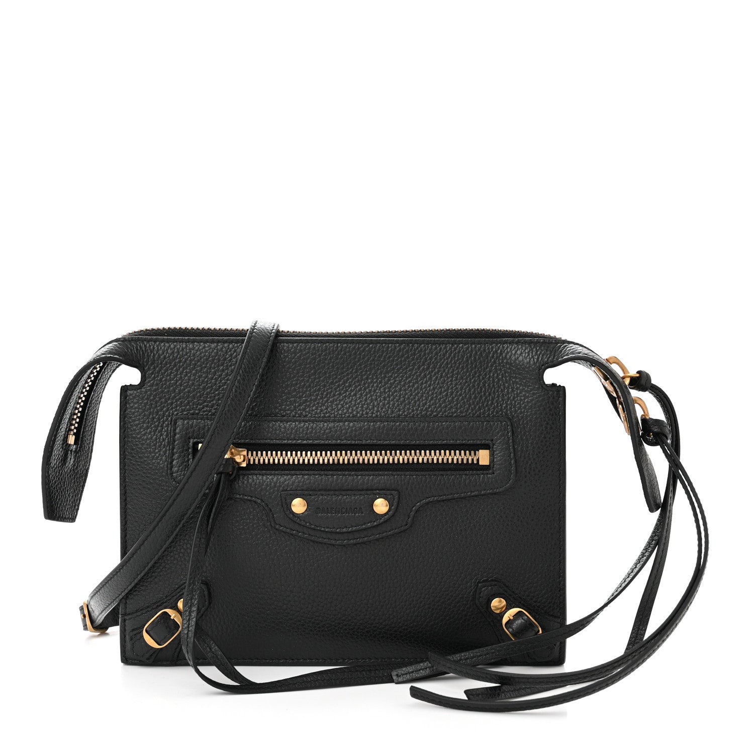BALENCIAGA Grained Calfskin Neo Classic Gold Hardware Multipouch in Black. This stylish clutch is crafted of calfskin leather. The bag features an adjustable leather shoulder strap, decorative gold hardware including gold buckles, studs, and a front zipper pocket. The top zipper opens to a black leather partitioned interior with a patch pocket and card slots.
