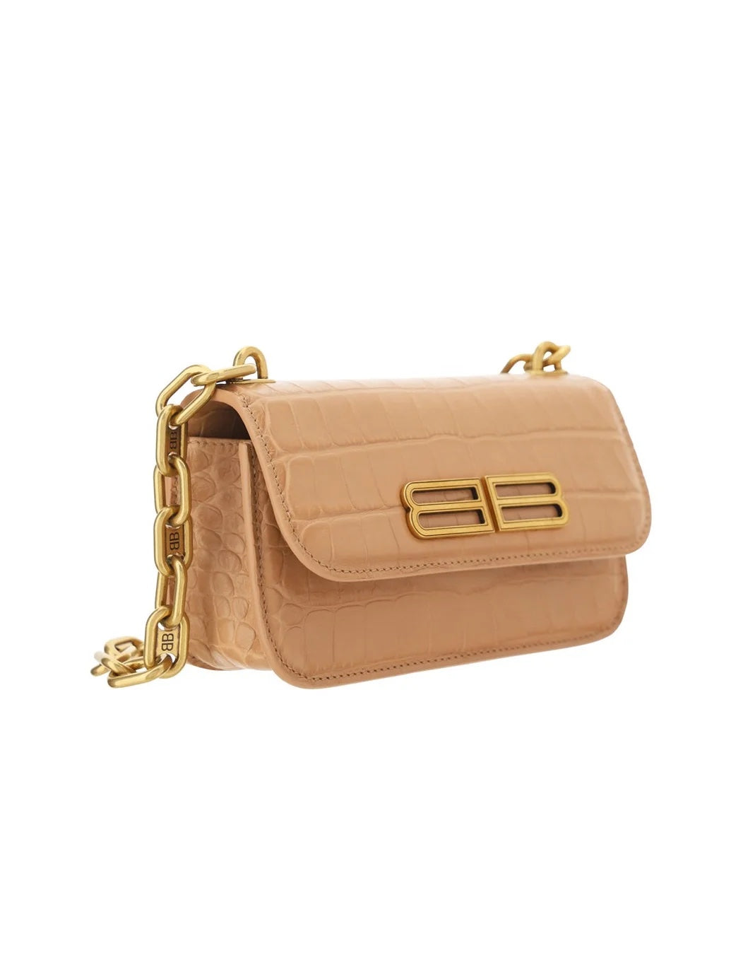 Beige ‘Gossip XS’ shoulder bag from Balenciaga. Crafted from calf leather with a crocodile skin effect, this design fastens via a snap button and showcases BB hardware on the front, a slip pocket at the back, a logo-engraved chain strap, gold-tone metal elements and a lamb leather-clad interior with one compartment, one slip pocket and four card slots.