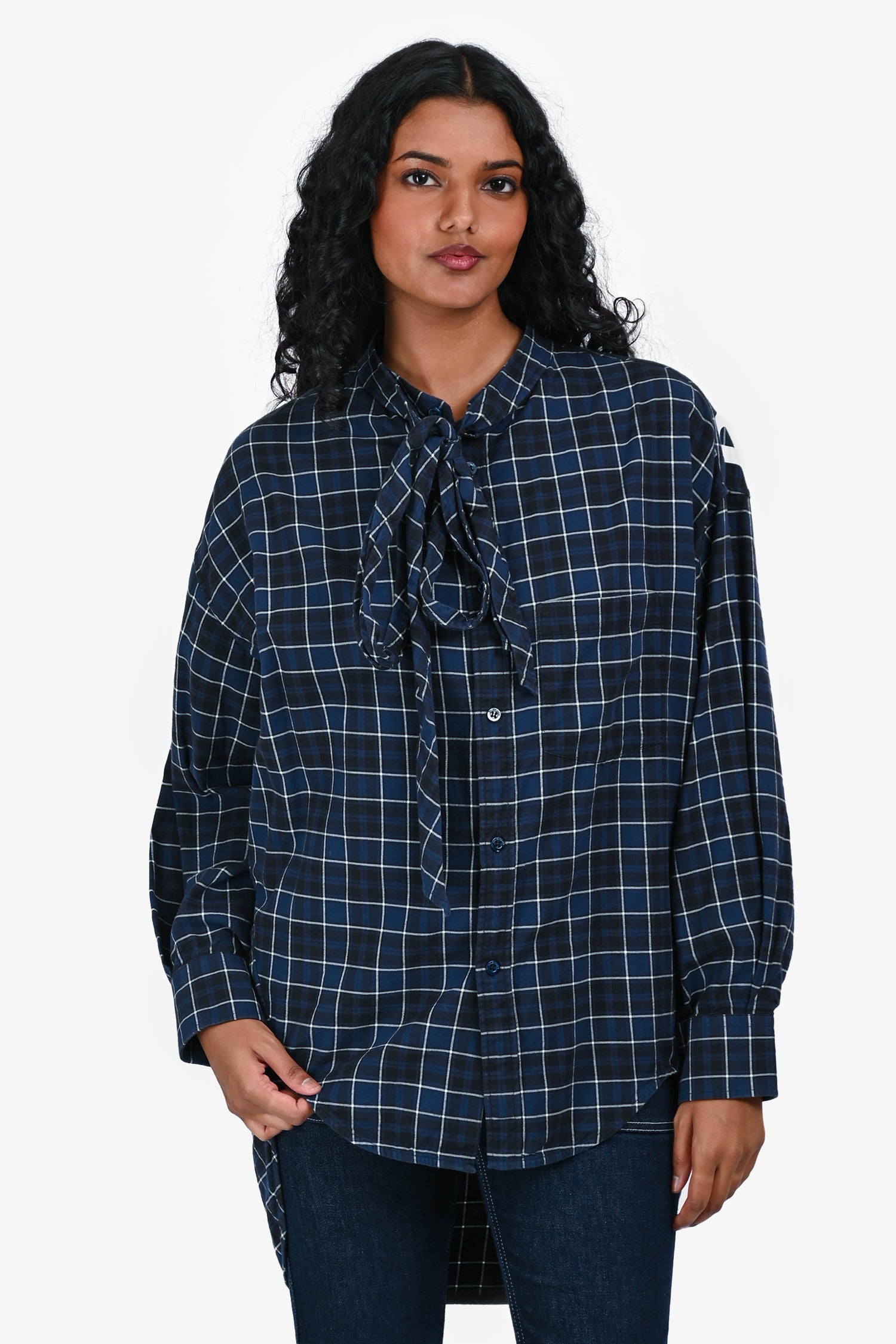 Balenciaga Navy Check Cotton Oversized Shirt With Tie Detail. Button-front closure. Long sleeves with button closure. Tonal stitching.