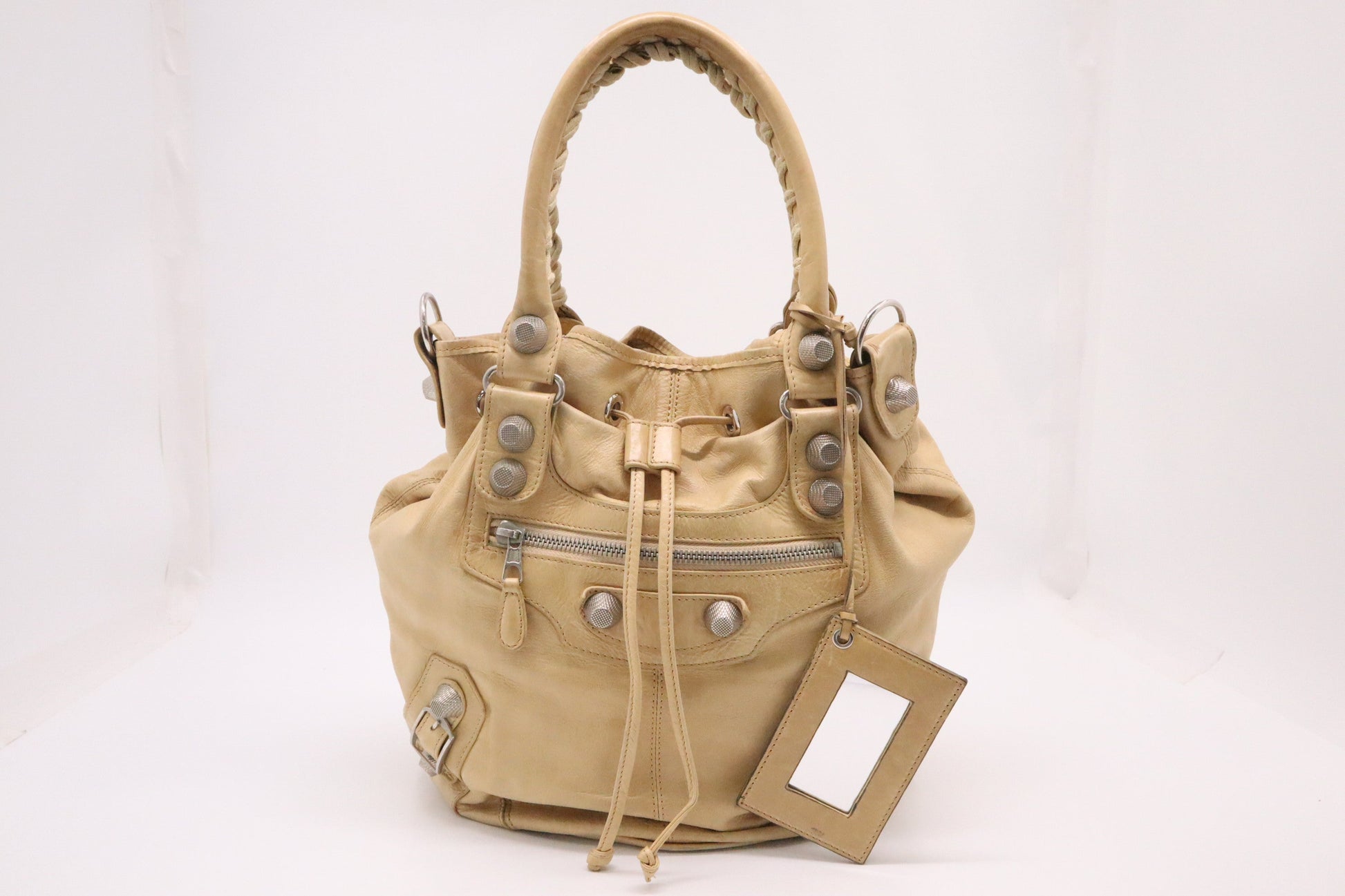 Balenciaga Pompon Shoulder Bag in Beige Leather
