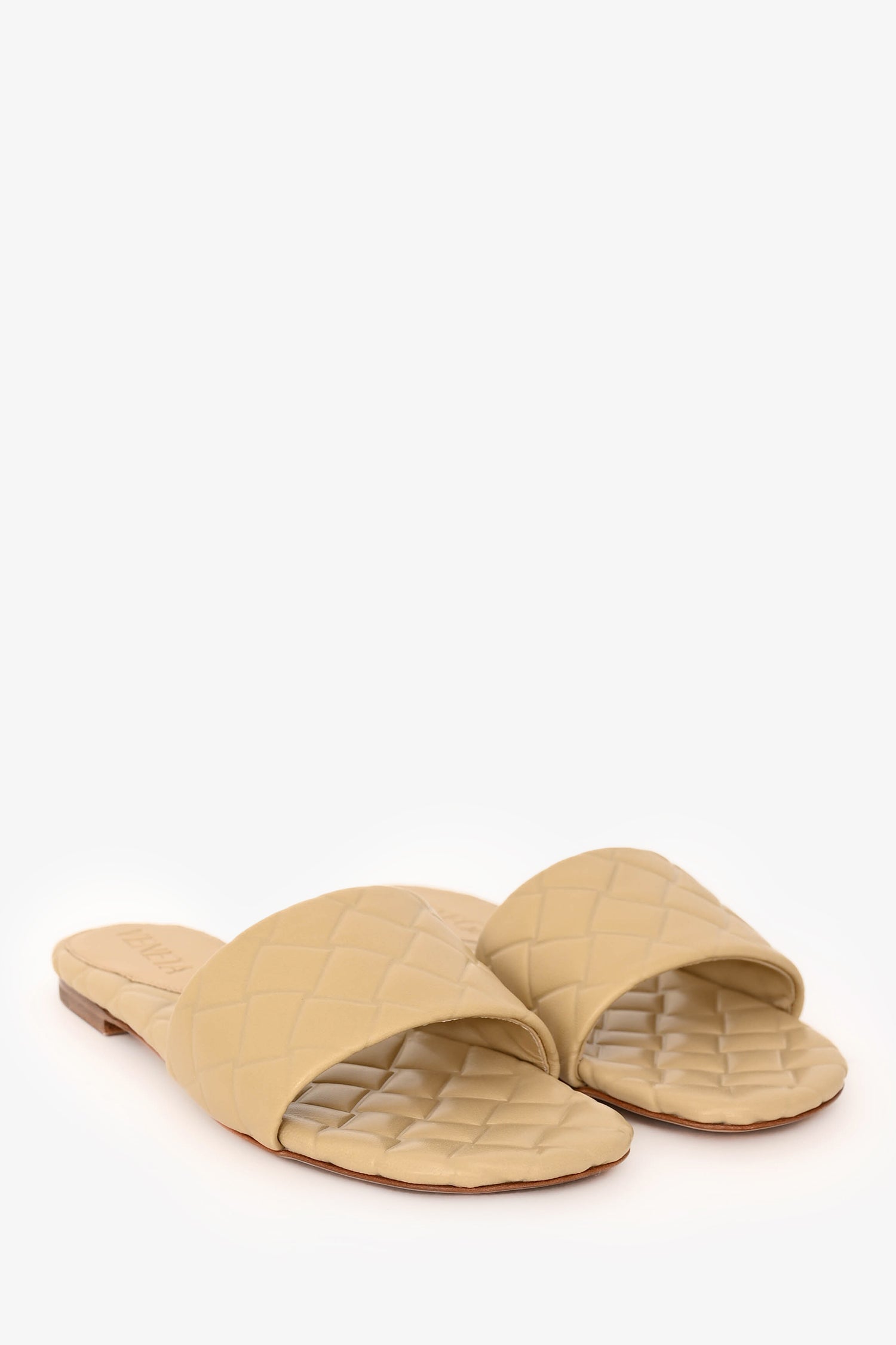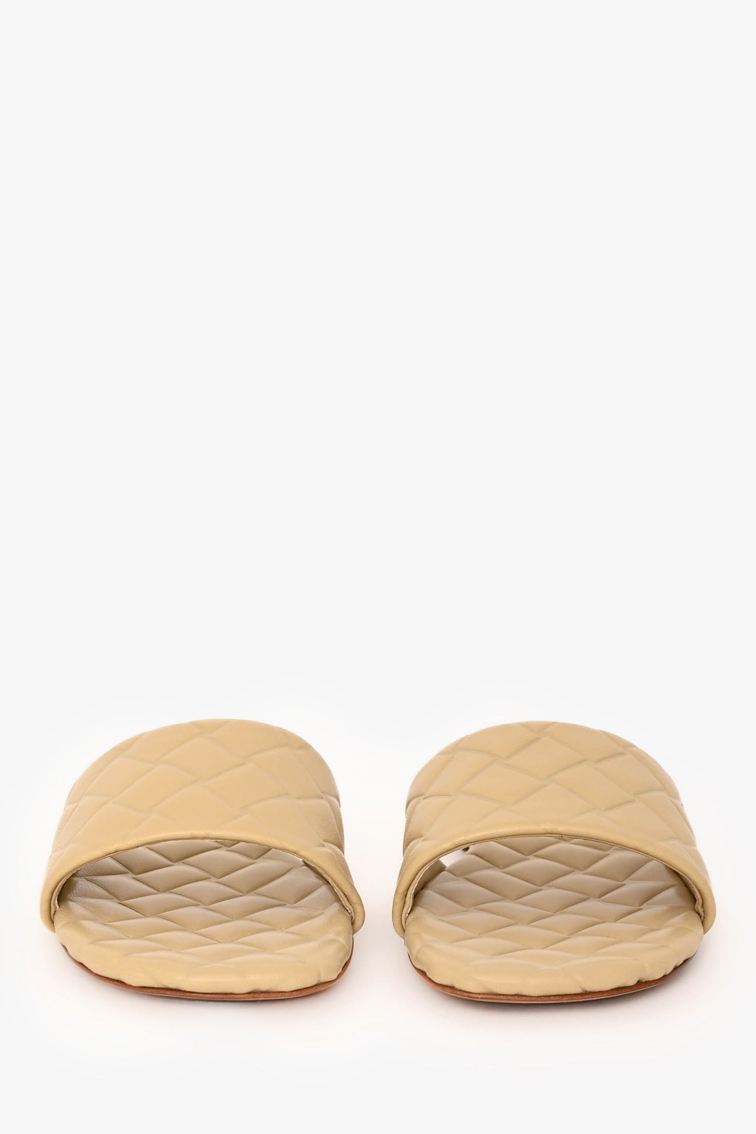 Bottega Veneta Beige Leather Amy Sandals. Slip-on. Open square toe. Wide woven leather upper strap. Leather lining and insole. Tonal stitching.