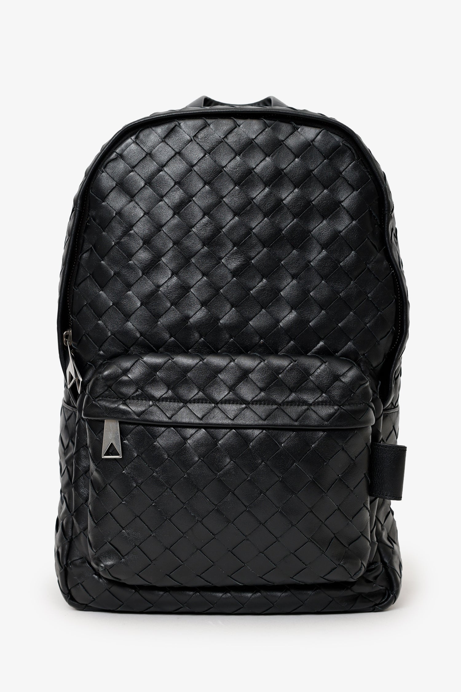 Bottega Veneta Black Intrecciato Leather Backpack. Top zip closure. Top handle. 2 over-the-shoulder adjustable backpack straps with pull-through buckle closure. Front pocket with zipper closure. Lined interior. 1 interior slip pocket. Silver-tone hardware. Tonal stitching.