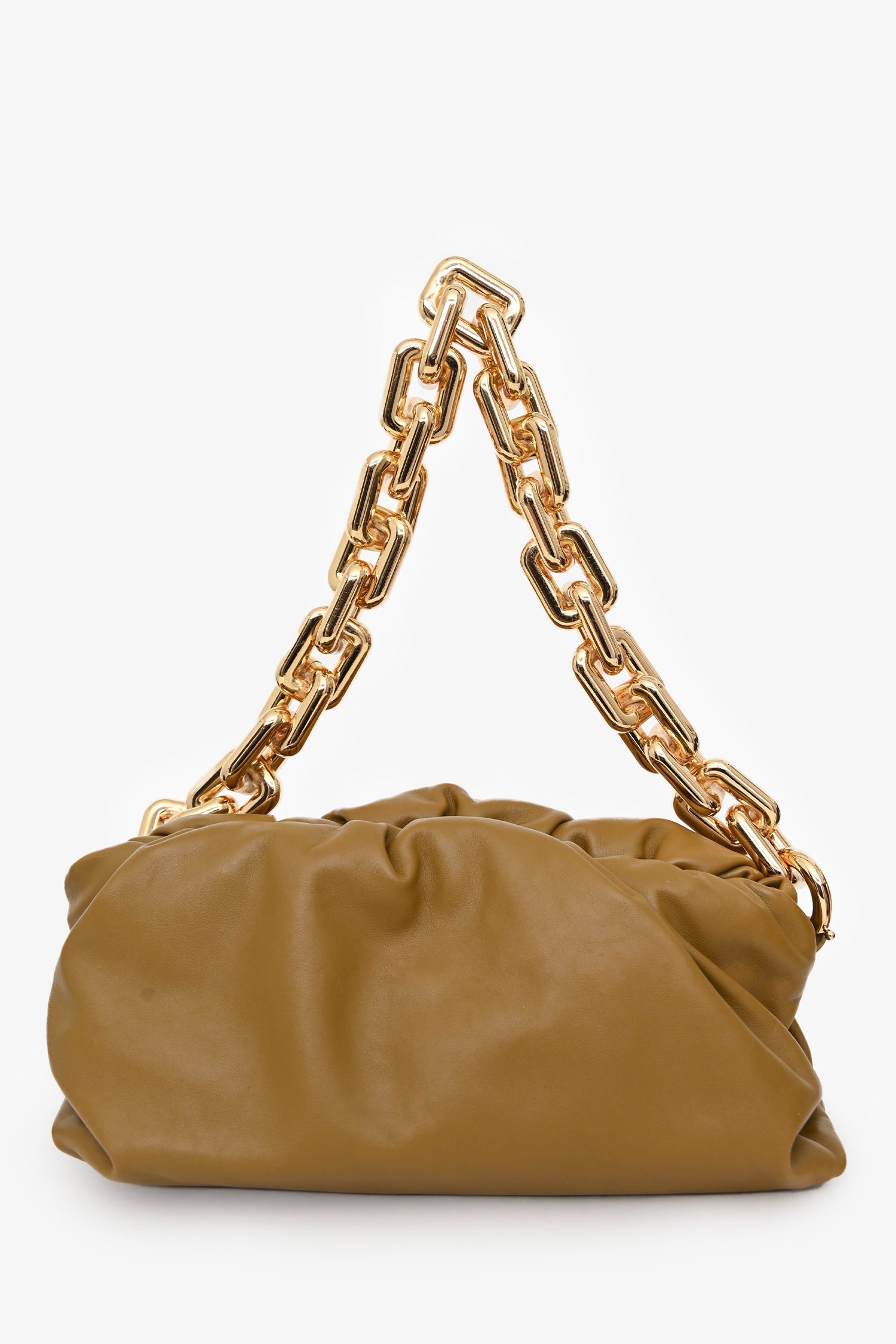 Bottega Veneta Brown Leather Chain Pouch. Concealed top hinge opening. Chain-link shoulder strap. Leather-lined interior. Gold-tone hardware. Tonal stitching.