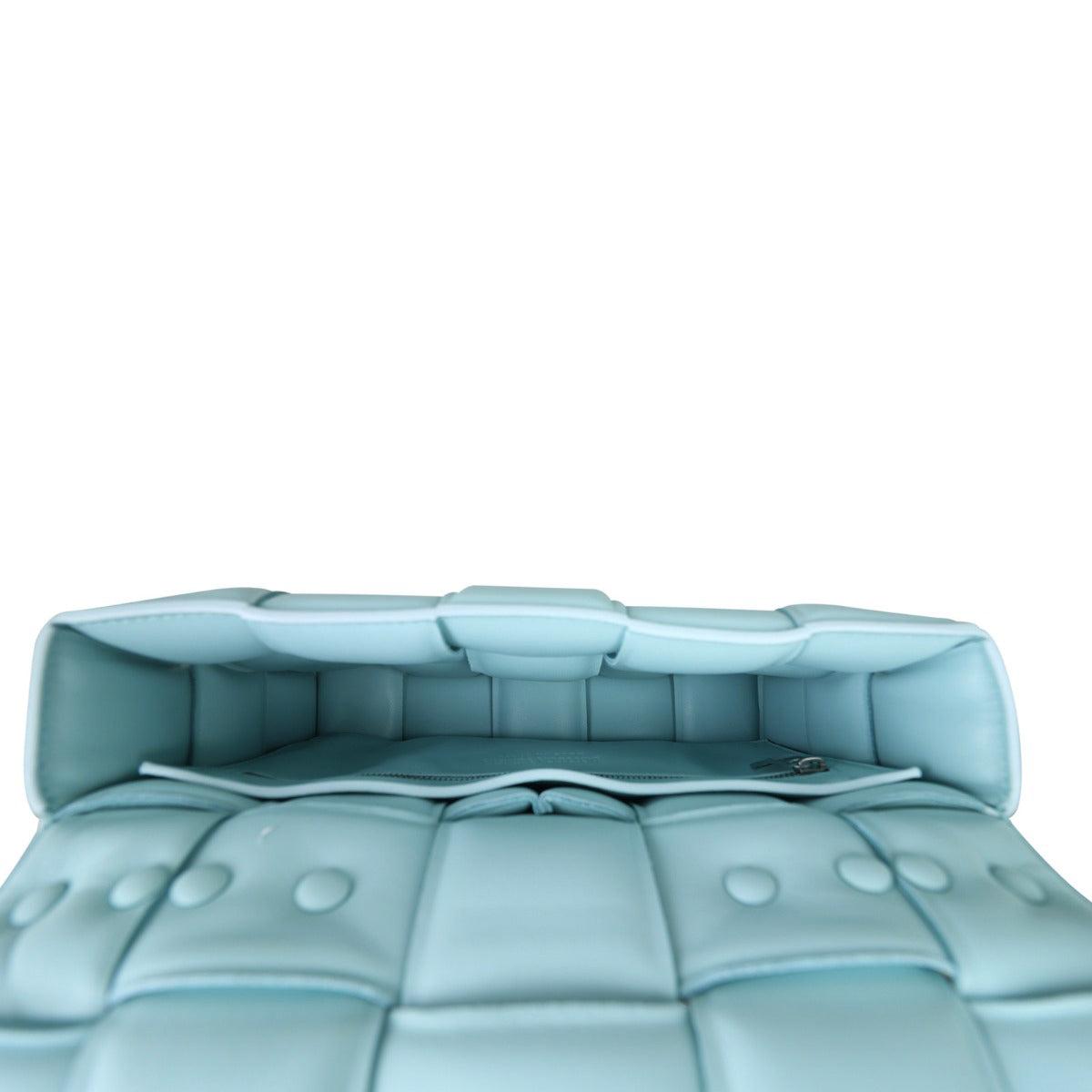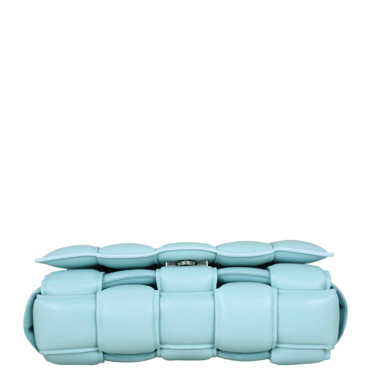 Features: Blue intrecciato hand woven nappa lambskin leather padded exterior; silver tone hardware; chain shoulder strap and top handle; top flap with concealed slide closure to main compartment; tonal leather unlined interior with 1 x hanging zipped pocket.