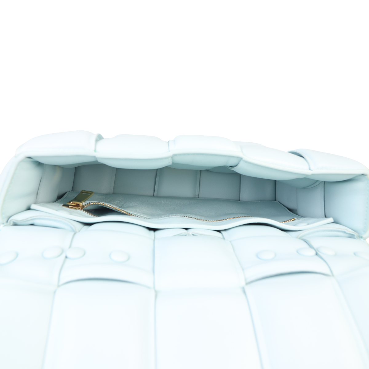 Features: Light blue intrecciato hand woven nappa lambskin leather padded exterior; gold tone hardware; chunky chain shoulder strap and top handle; top flap with concealed slide closure to main compartment; tonal leather unlined interior with 1 x hanging zipped pocket.