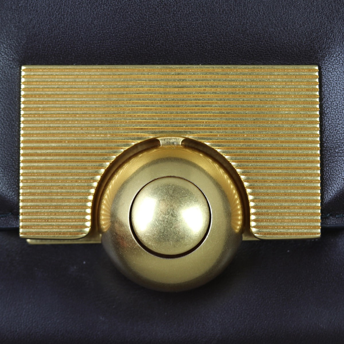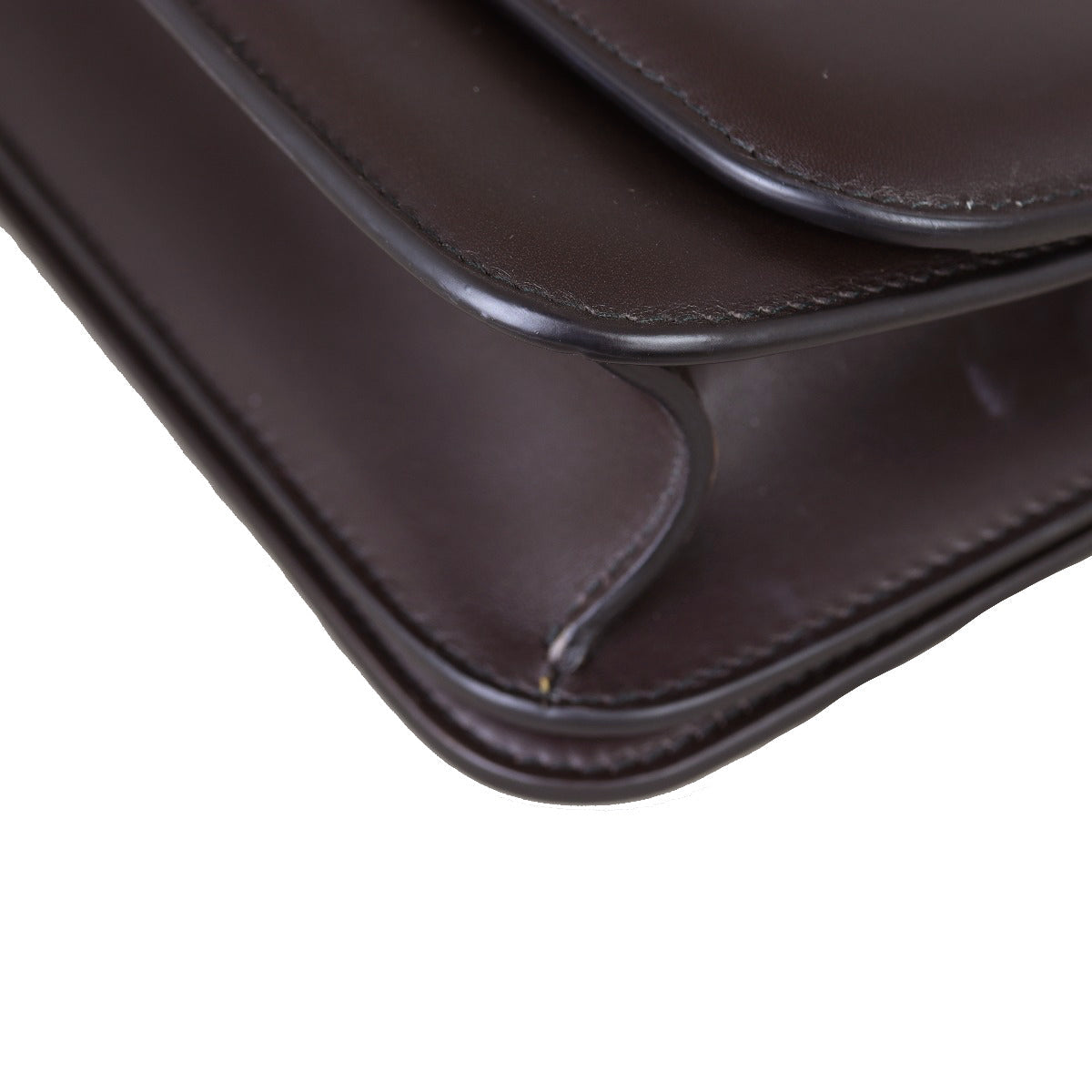 Features: Dark chocolate brown smooth leather exterior; antique gold tone hardware; adjustable flat leather shoulder strap; flap top with push lock closure to main compartment; tonal leather lined interior with 1 x zipped pocket and 1 x slip pocket.