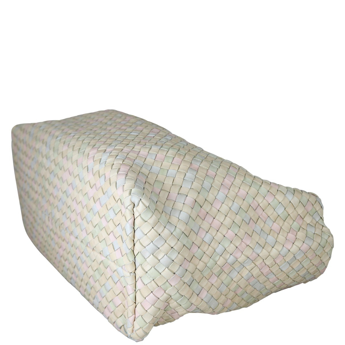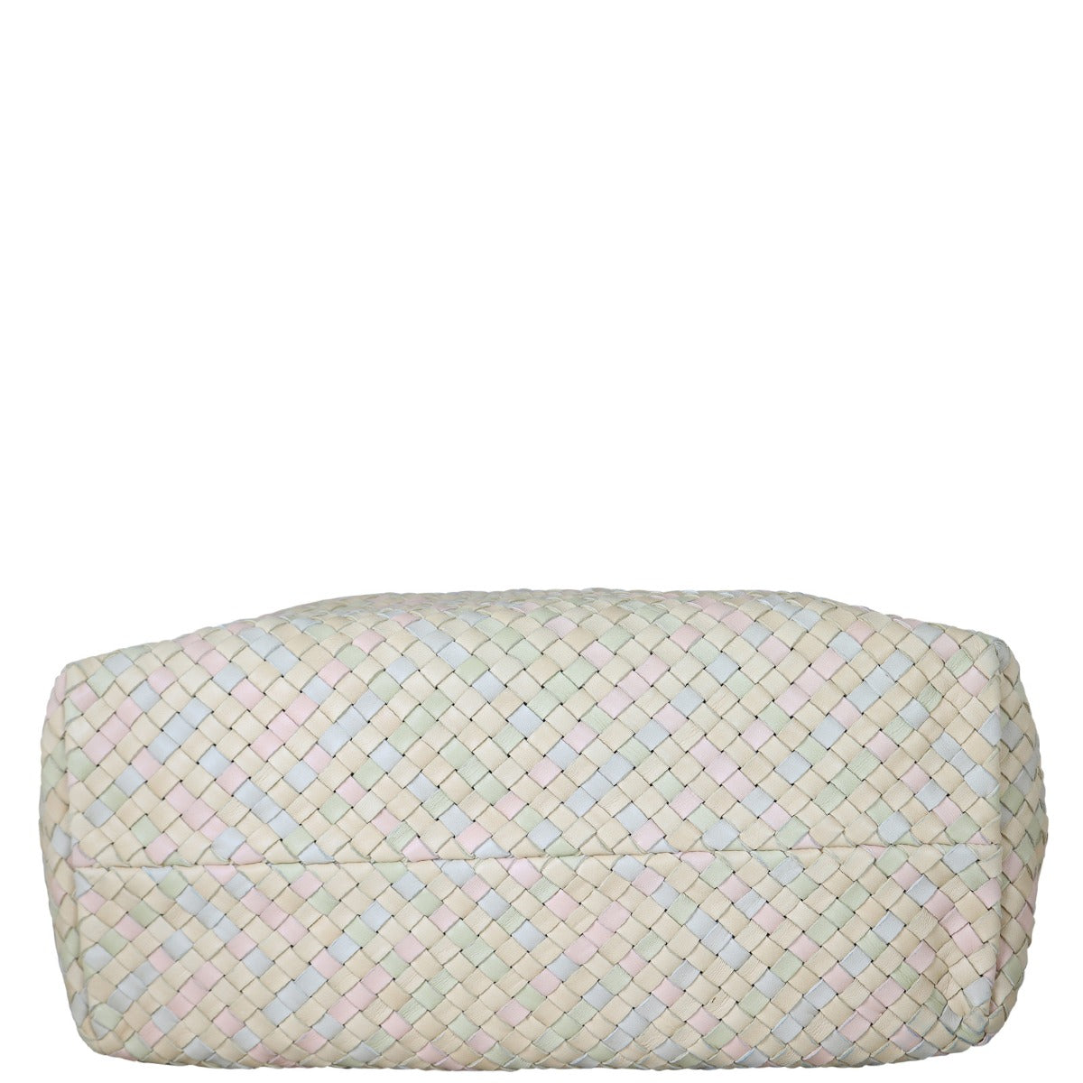 Features: Pastel cream, blue, green and pink intrecciato hand woven nappa leather exterior; gold tone hardware; double rolled handles; open top to main compartment; unlined interior with detachable zipped pouch.