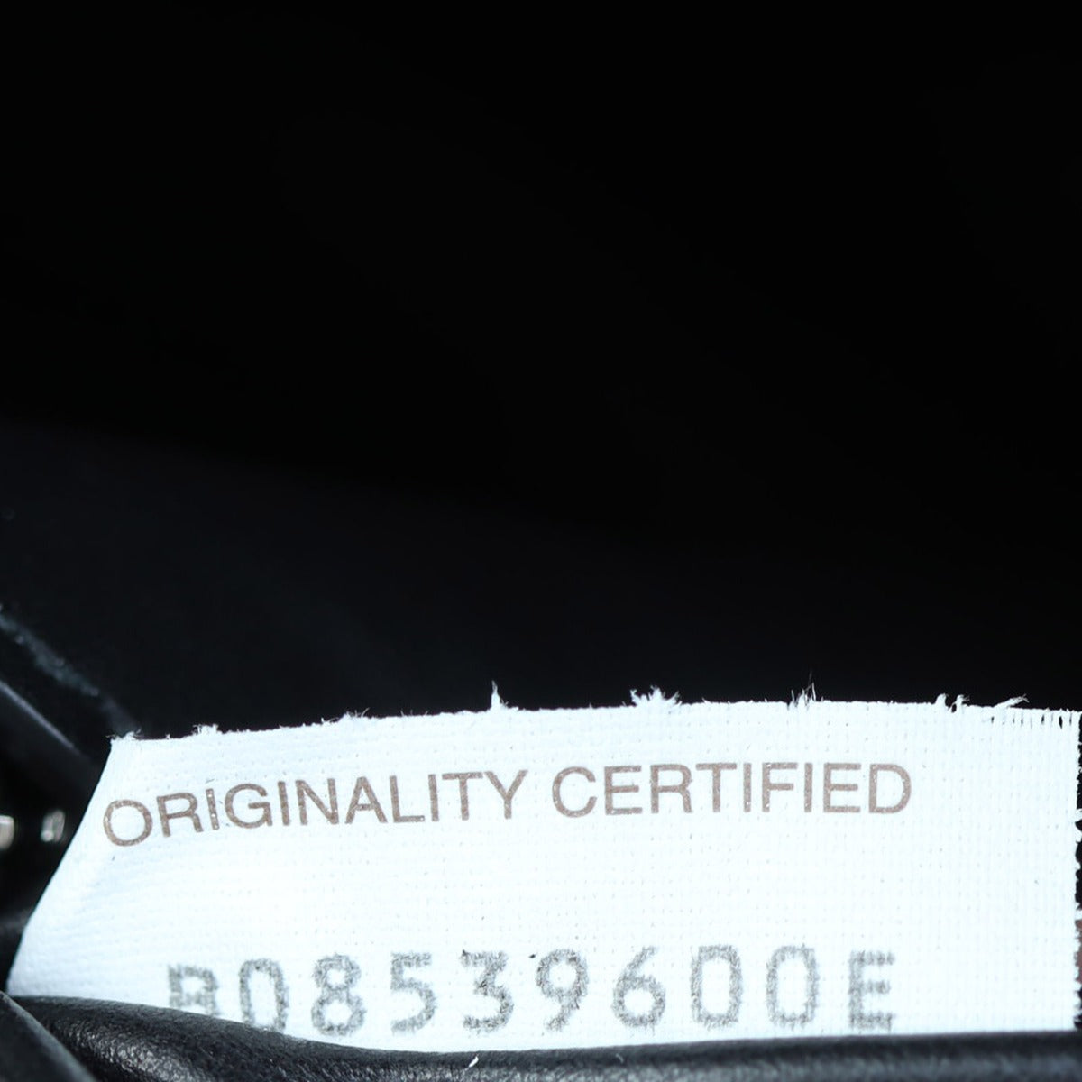 Features: Black intrecciato interwoven nappa lambskin leather exterior; silver tone hardware; detachable and adjustable leather shoulder strap; square-shaped flap with double magnetic closures; tonal leather lined interior divided into two compartments with 1 x slip pocket and 1 x zipped pocket.