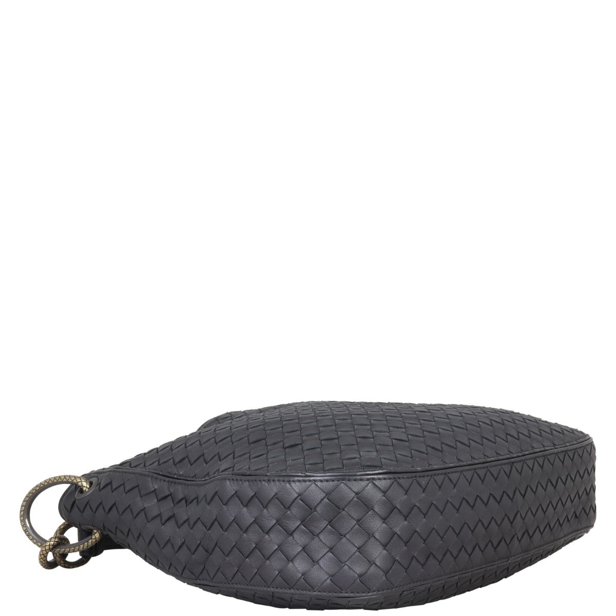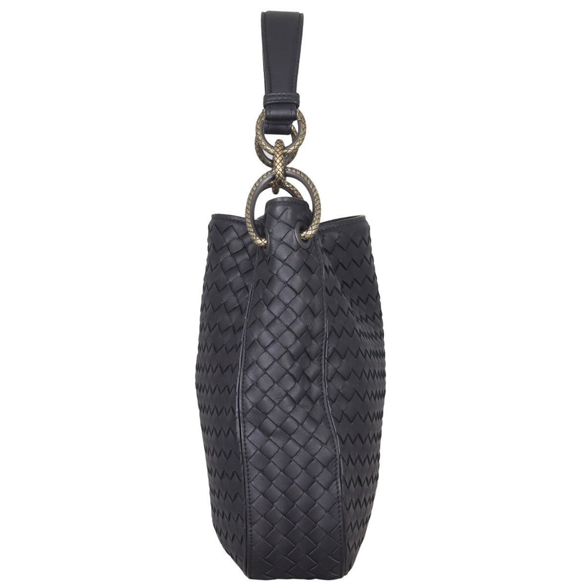 Features: Black nappa leather handwoven in the signature Intrecciato pattern; antiqued brass gold tone hardware; shoulder strap with leather shoulder pad and oversized textured metal loops; open top to tonal suede lined interior with 1 x zipped pocket and 1x slip pocket; removable leather backed mirror.