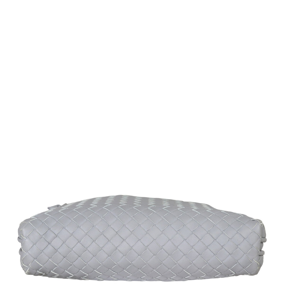 Features: Grey intrecciato hand woven nappa lambskin leather exterior; matte gunmetal tone ‘brunito’ hardware; adjustable shoulder strap; double top zip closure to main compartment; mocha suede lined interior with 1 x zipped pocket, 1 x slip pocket and removable leather encased mirror.