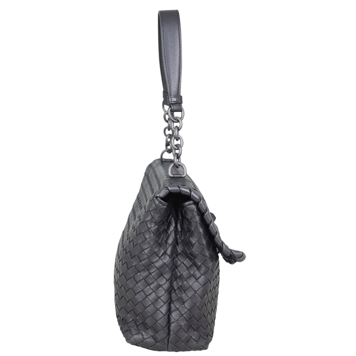 Features: Black intrecciato interwoven nappa lambskin leather exterior; matte gunmetal 'brunito' hardware; short chain strap with leather shoulder pad; top flap with double magnetic closures; mocha suede-lined interior divided into two compartments with 1 x slip pocket and 1 x zipped pocket.