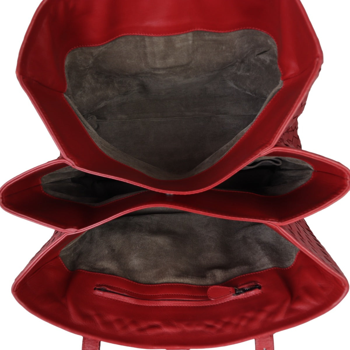 Features: Red intrecciato hand woven calfskin leather exterior; adjustable double rolled top handles; gunmetal tone hardware; belted push-lock entry; 1 x key on detachable leather strap; brown suede lined interior split into three main compartments; central compartment secured by magnetic dome closure; 1 x zipped pocket and 1 x slip pocket.
