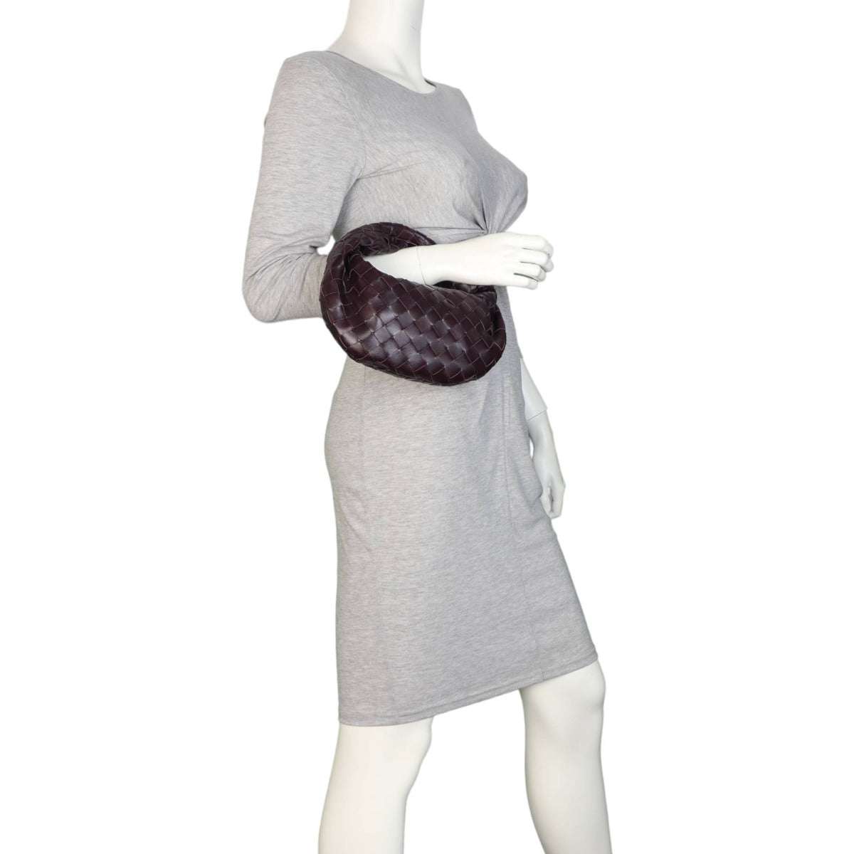 Features: Aubergine intrecciato leather exterior; single top handle with a knotted base on one side; gold tone hardware; top zip opening to main compartment; leather lined interior.