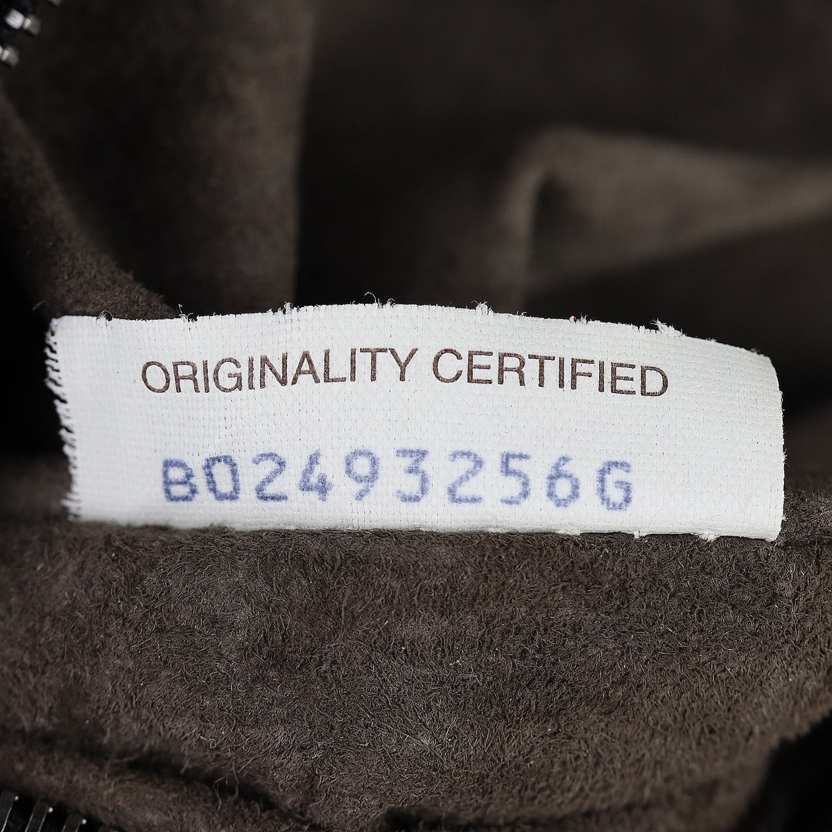 Features: Black smooth nappa leather exterior; woven leather handles; brunito matte gunmetal hardware; double zip closure to main compartment; mocha suede lined interior with 1 x zipped pocket and 1 x slip pocket; removable leather lined mirror.