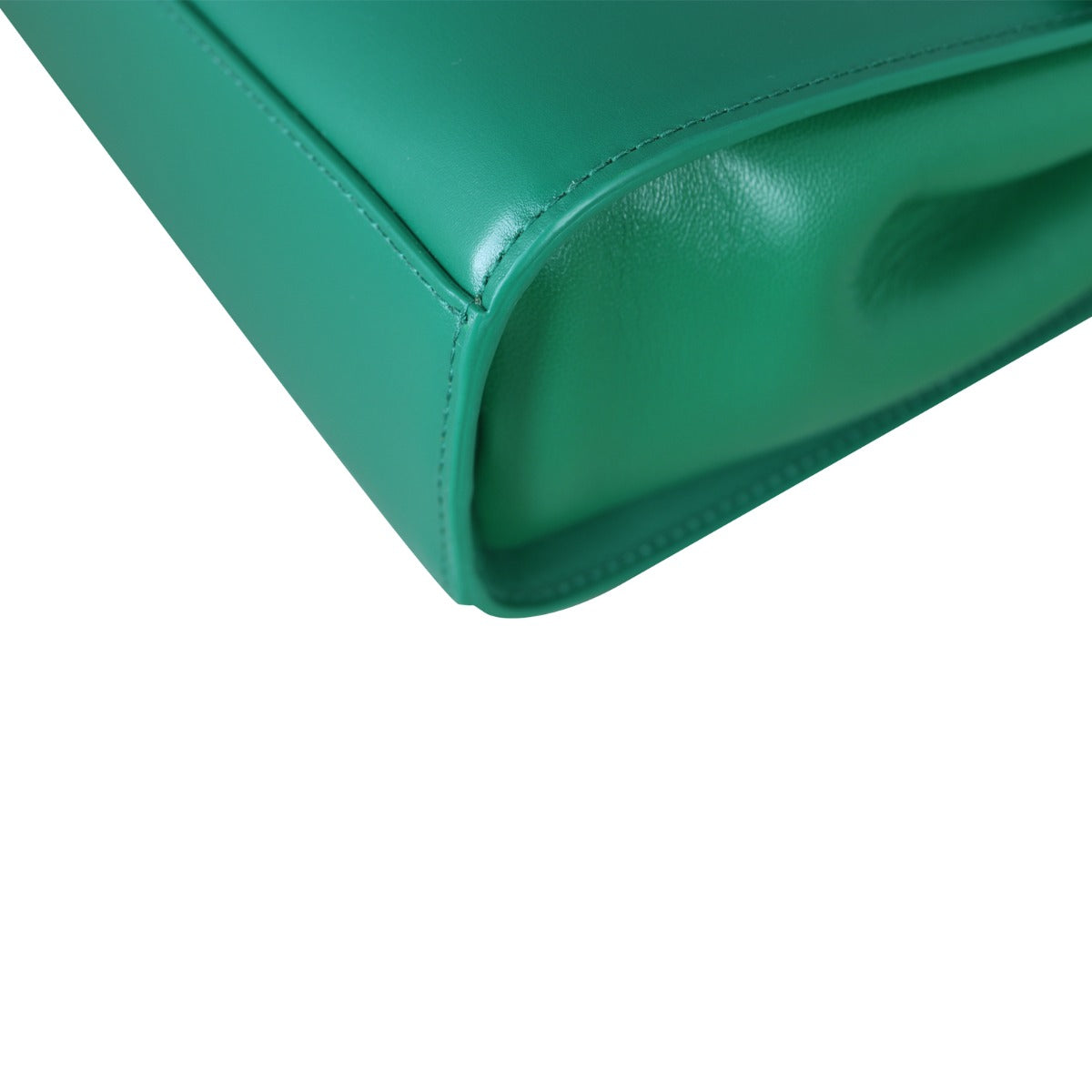 Features: Green smooth leather exterior; antiqued silver tone hardware; adjustable and detachable flat leather shoulder strap; exterior front slip pocket under flap; flap top with push slide closure to main compartment; tonal leather lined interior with 1 x zipped pocket.