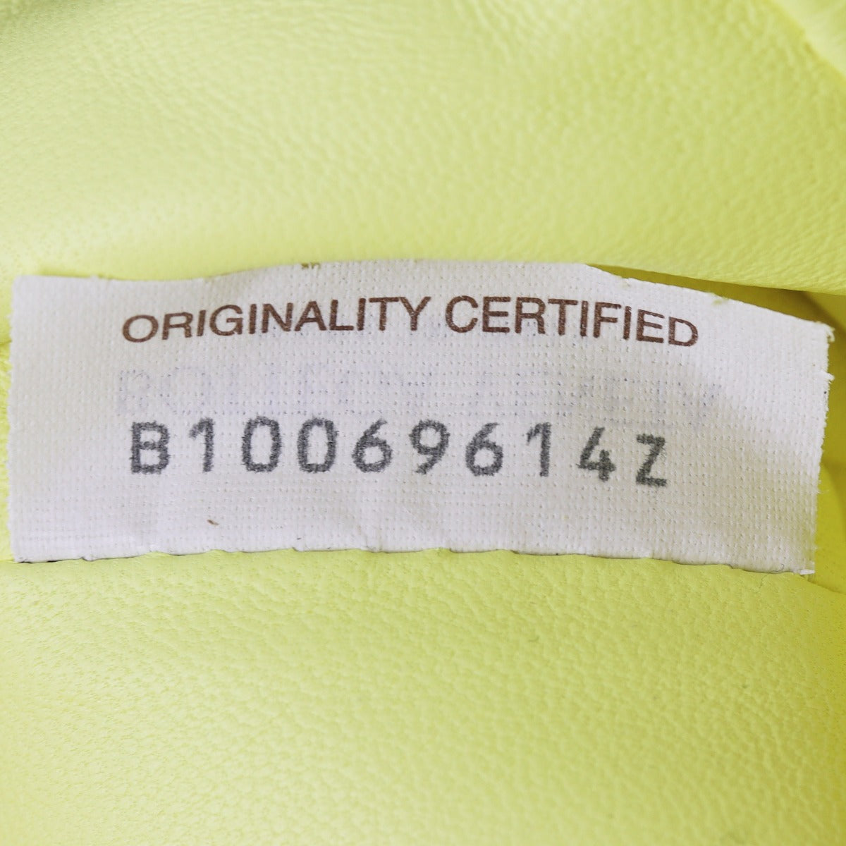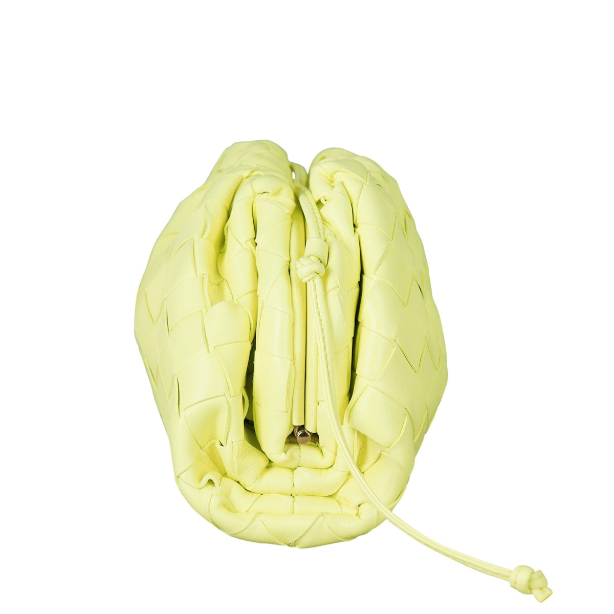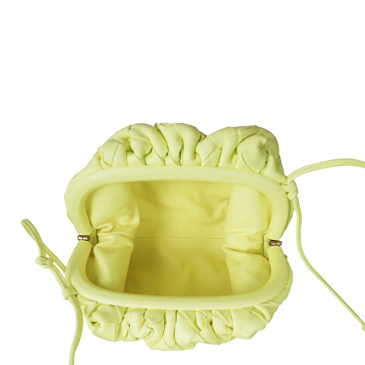 Features: Lantern-gold (yellow) intrecciato lambskin leather exterior; gold tone hardware; slim leather shoulder strap that can be adjusted by knotting; magnetic frame top closure opens to tonal leather lined interior.