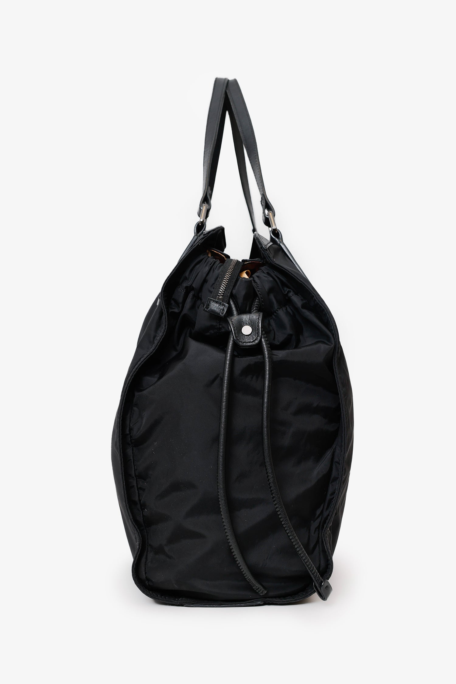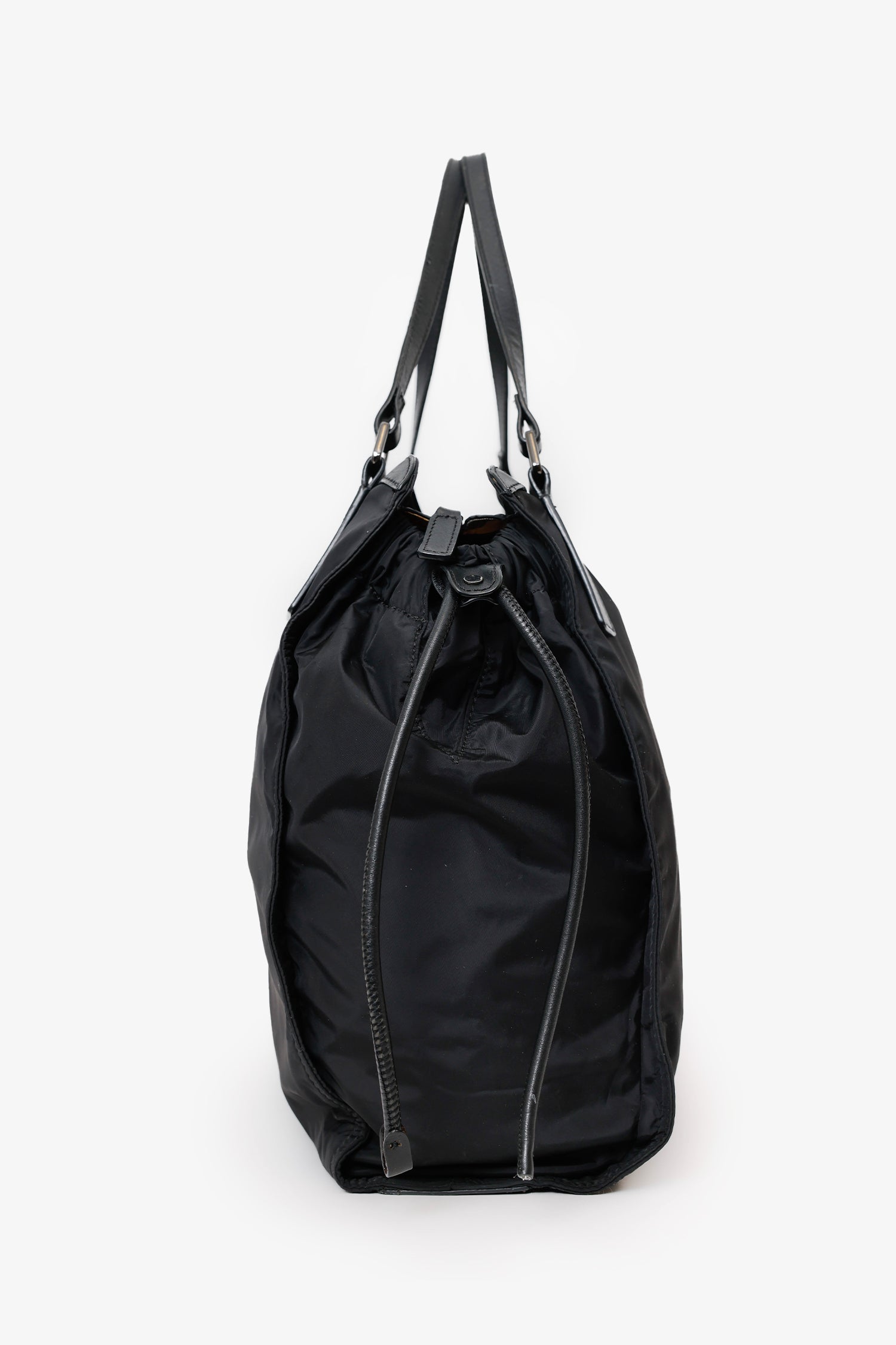 Burberry Black Nylon Tote Bag. Top zip closure. Twin leather shoulder straps. Cinching closure on side exterior. Lined interior. Single interior zip pocket. Palladium-tone hardware. Tonal stitching.