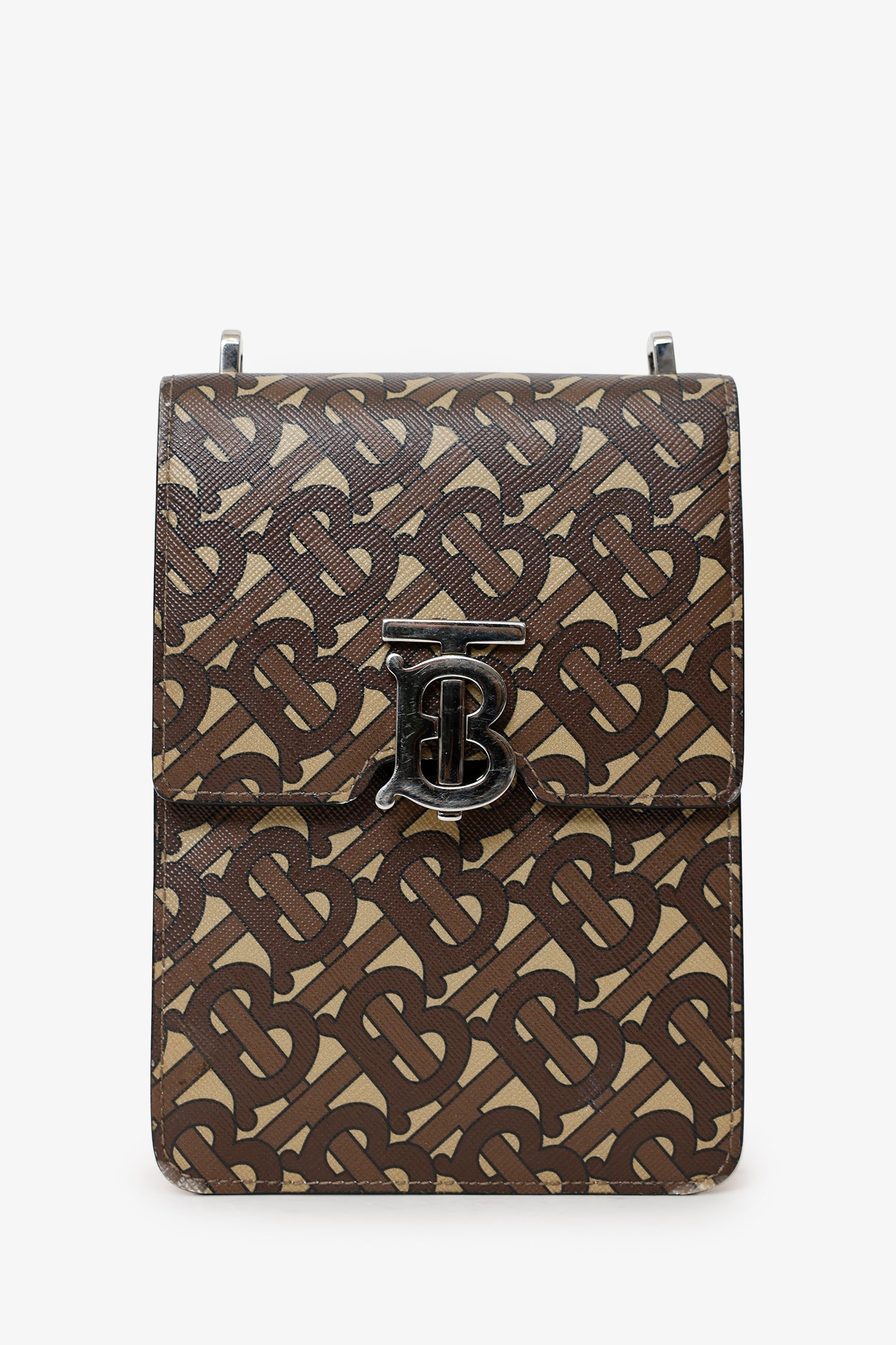Burberry Brown TB Monogram Print E-Canvas Robin Bag. Front fold-over flap with clasp closure. Adjustable crossbody strap with push-pin buckle closure. 2 exterior pockets; 1 zip closure under front fold-over flap and 1 rear slip. Leather lined interior. 2 interior card holder pockets. Silver-tone hardware. Tonal stitching..Â