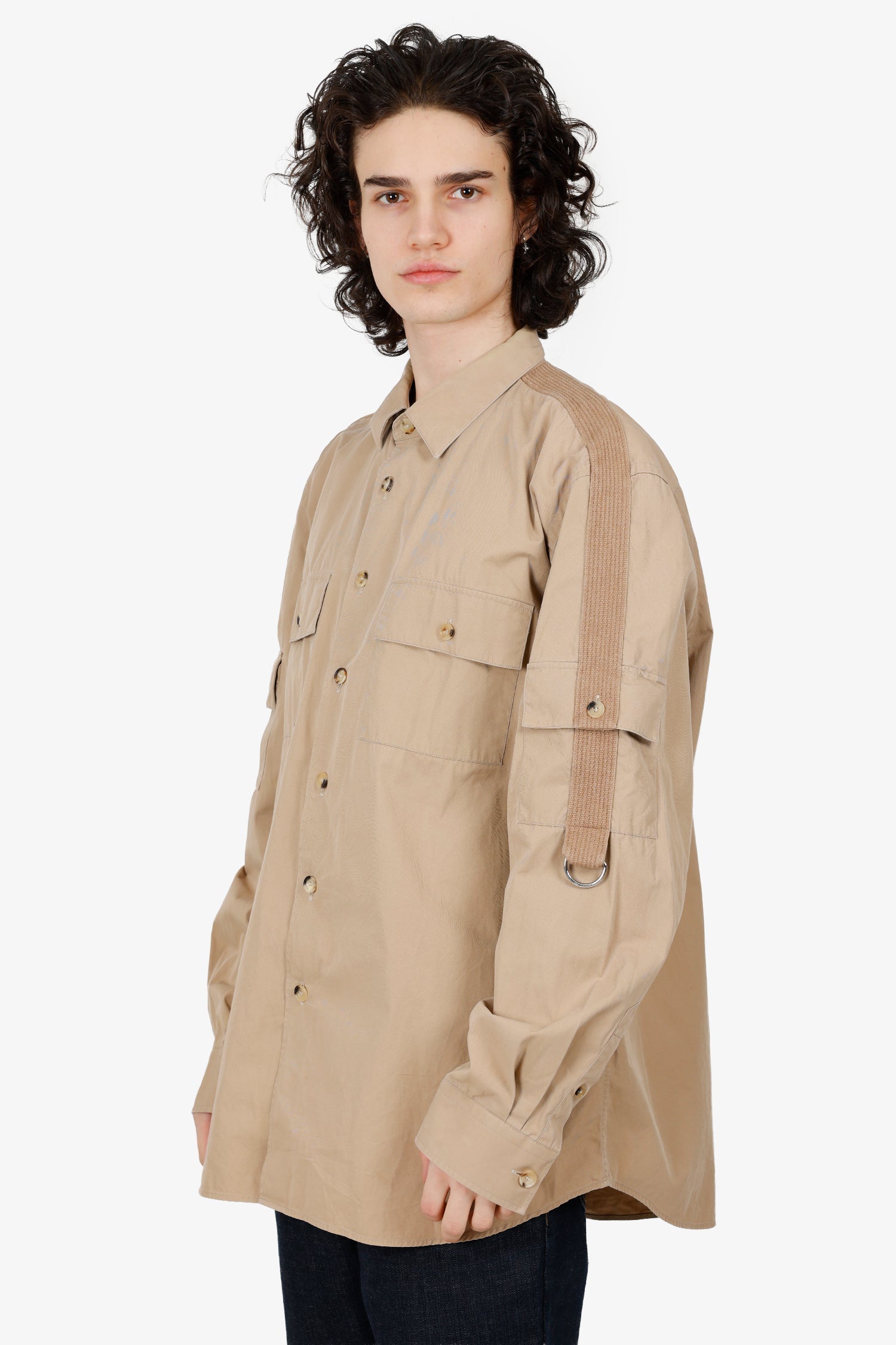 Burberry Tan Crawford Button Down Shirt. Collared-neckline. Front button-up closure. Sleeve cuffs with button-up closure. 4 exterior pockets; 2 chest flap with button-up closure and 2 flap with button-up closure on sleeves. Tonal stitching.