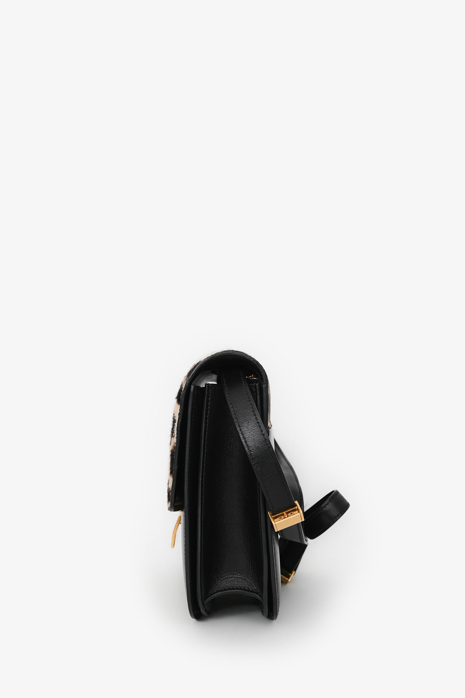 Celine Black Box Calfskin Pony Hair Leopard Medium Box Flap Bag. Front flap with push-lock closure. Adjustable leather shoulder strap. 2 interior compartments. 2 interior wall slip pockets. Single interior zip pocket. Gold-tone hardware. Tonal stitching.