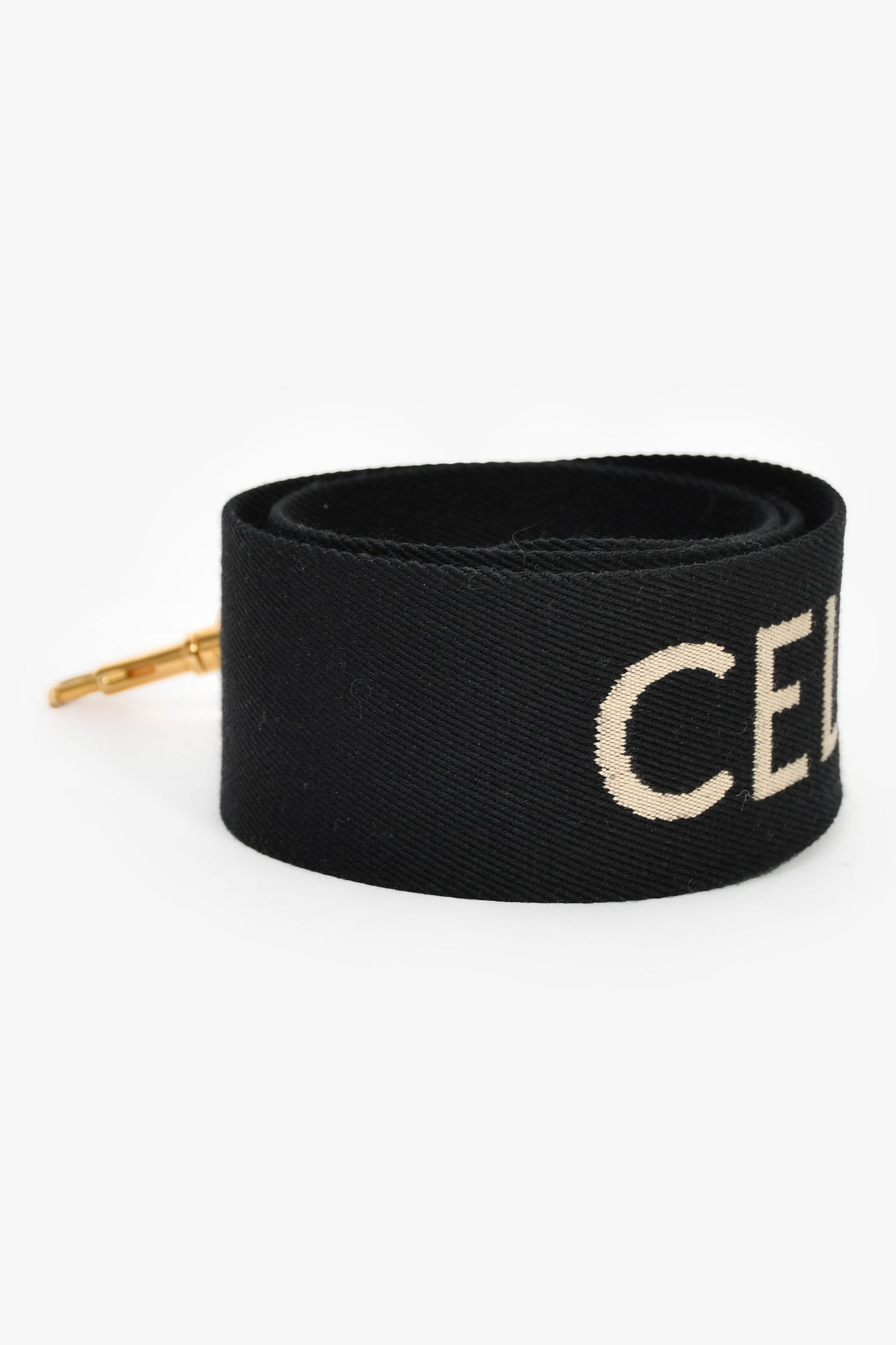 Celine Black Canvas Logo Bag Strap. Clasp closures. Gold-tone hardware. Tonal stitching.