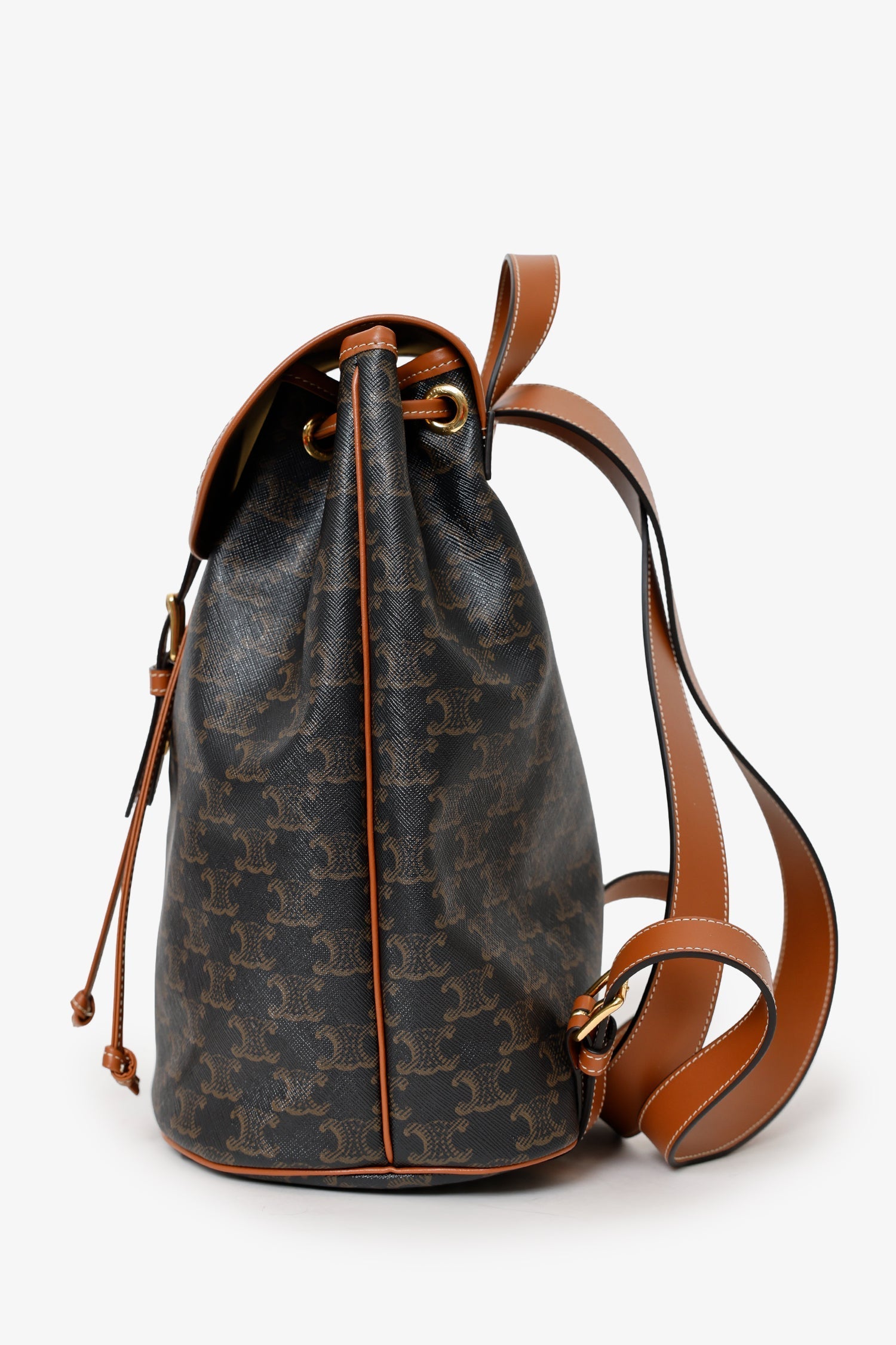 Celine Brown Triomphe Canvas/Calfskin Medium Backpack. Front fold-over flap with magnetic button-up and cinch cord closure. Adjustable push pin buckle closure to front fold-over flap. Top handle. Rear back straps with adjustable pull-through buckle closure. Textile lined interior. Single interior slip pocket. Gold-tone hardware. Contrast and tonal stitching.Â