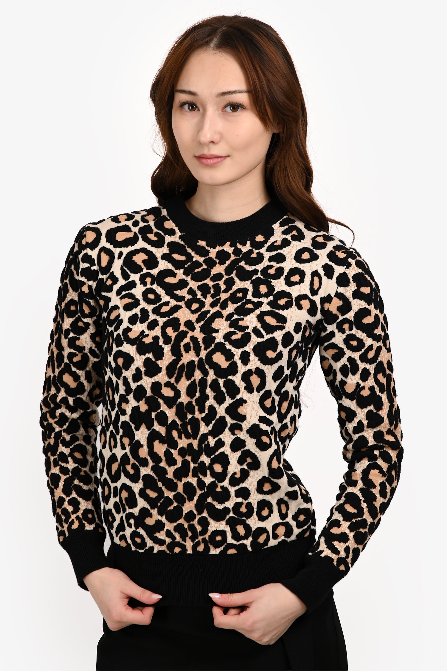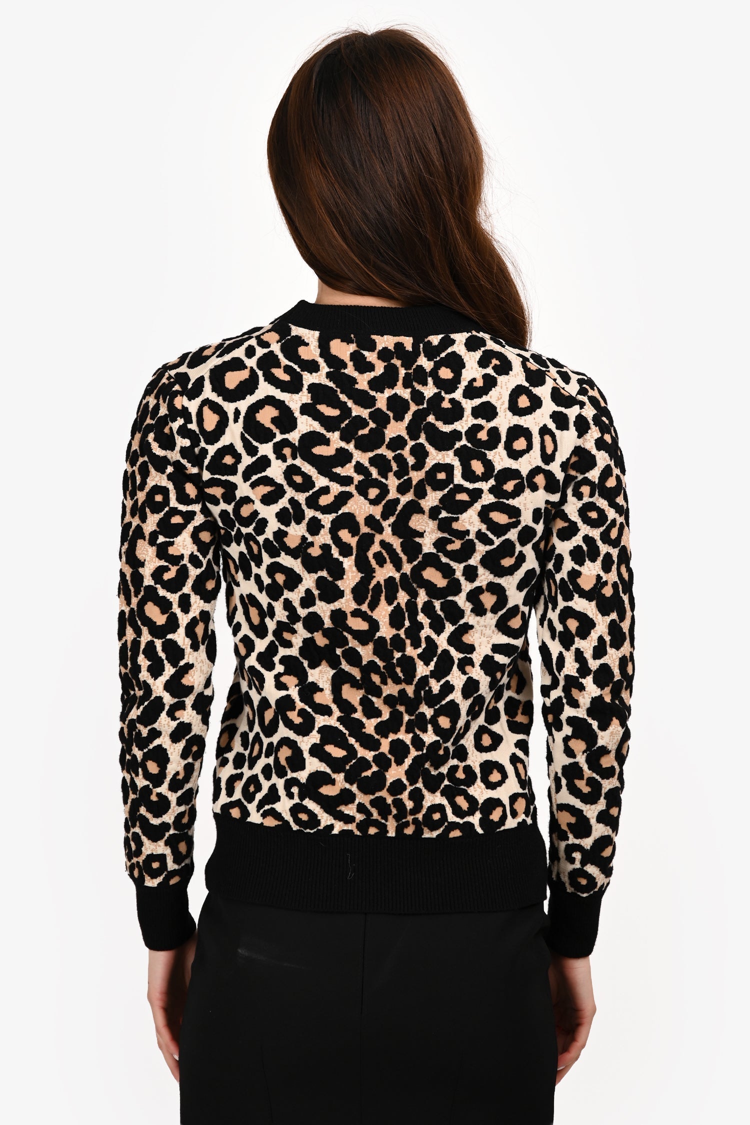 Celine Cheetah Print Crewneck Sweater. Pull-on. Round neckline. Ribbed neckline, cuffs, and hem. Tonal stitching.