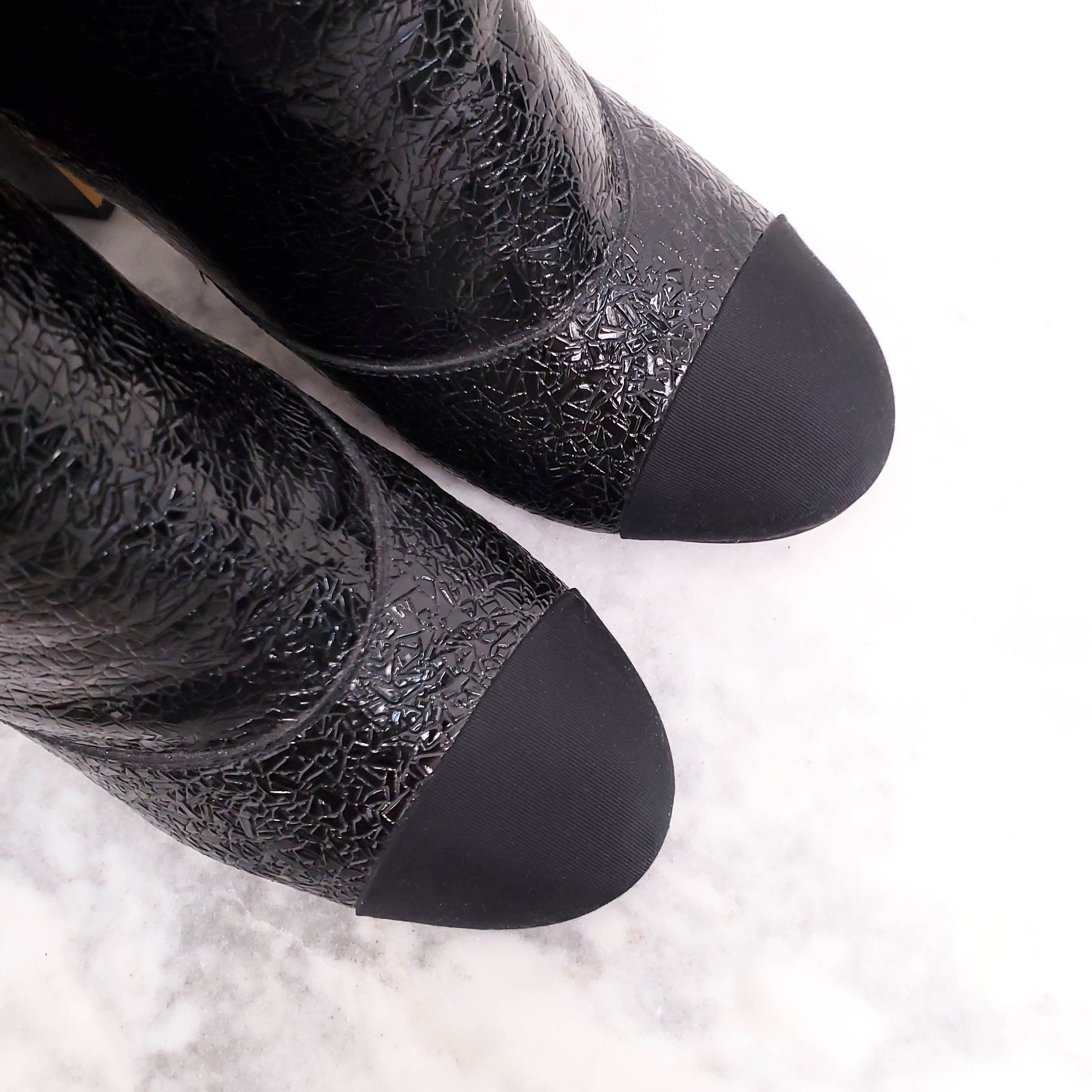 CHANEL BLACK PATENT CRINKLE EFFECT CAP TOE BOOTIES WITH ACRYLIC AND PEARL BLOCK HEEL - SIZE 42