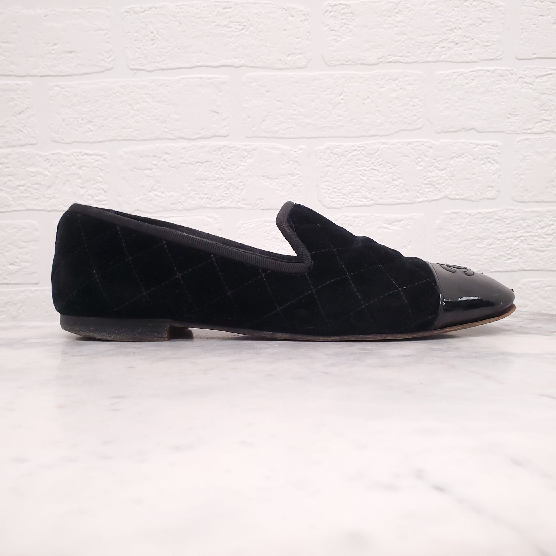 CHANEL BLACK VELVET QUILTED LOAFERS WITH LOGO - SIZE 40