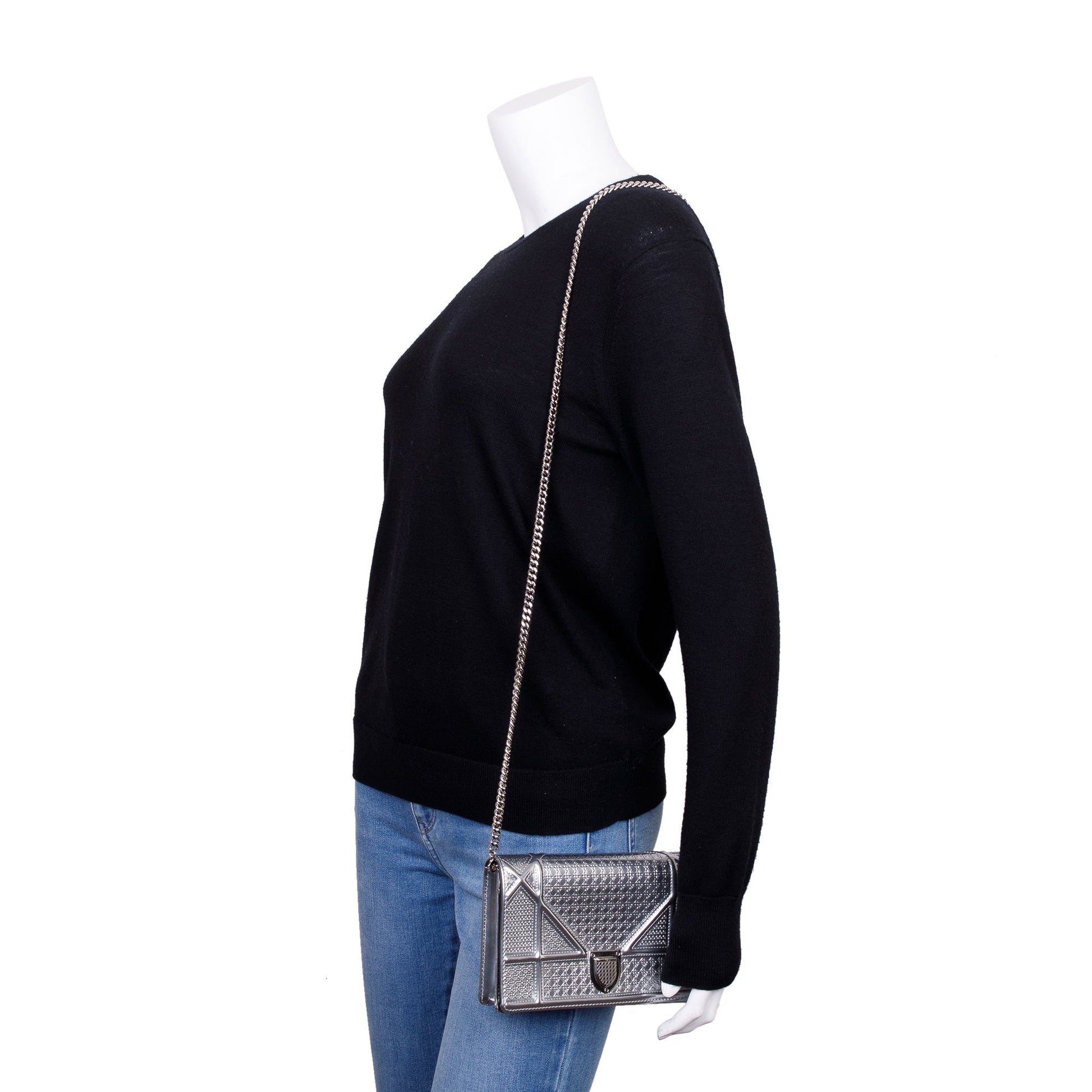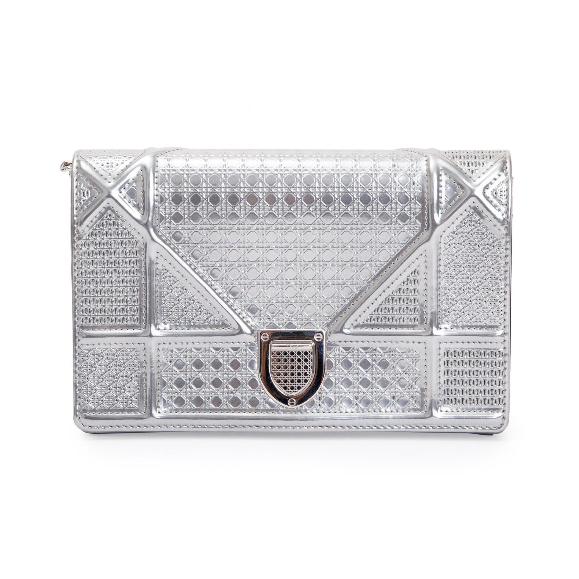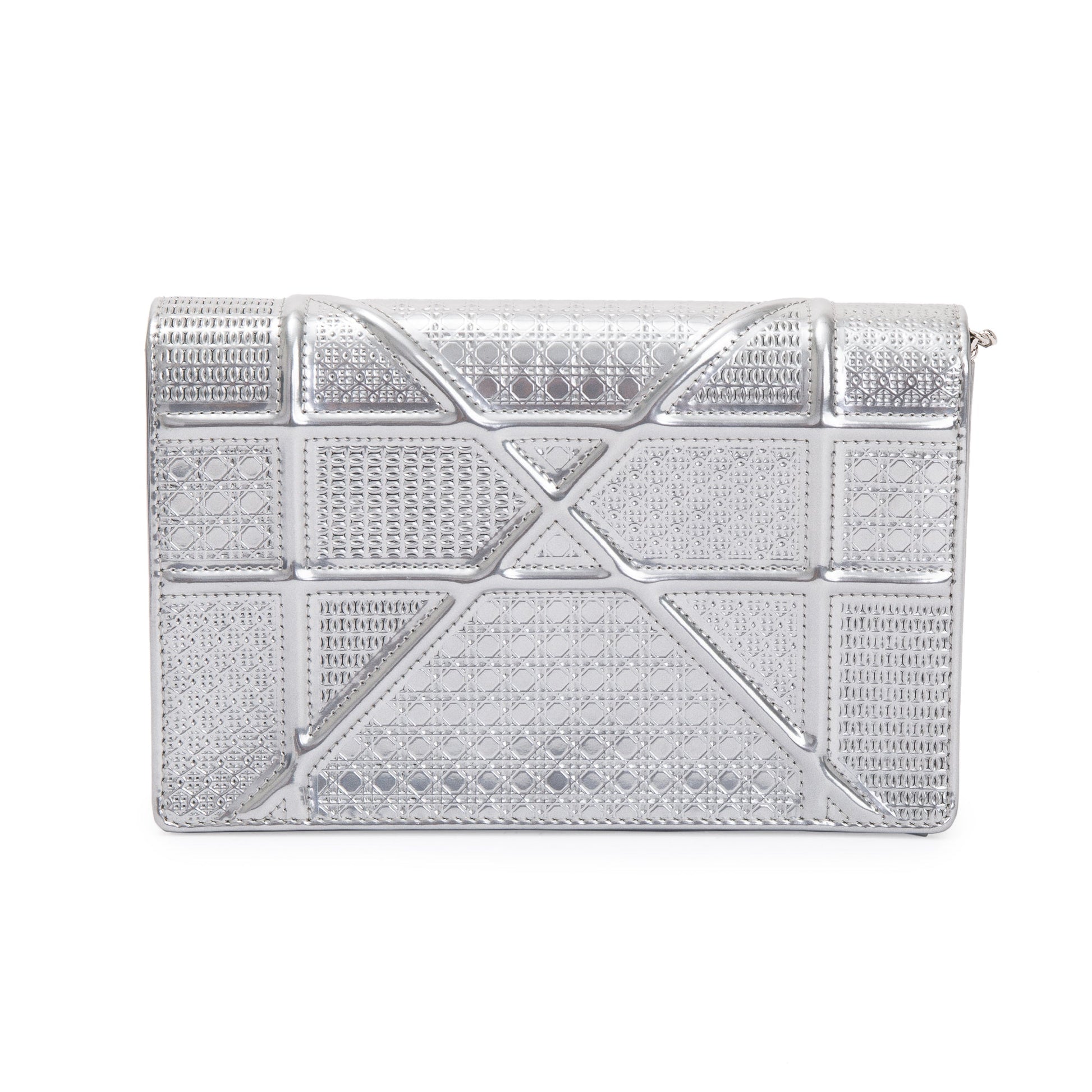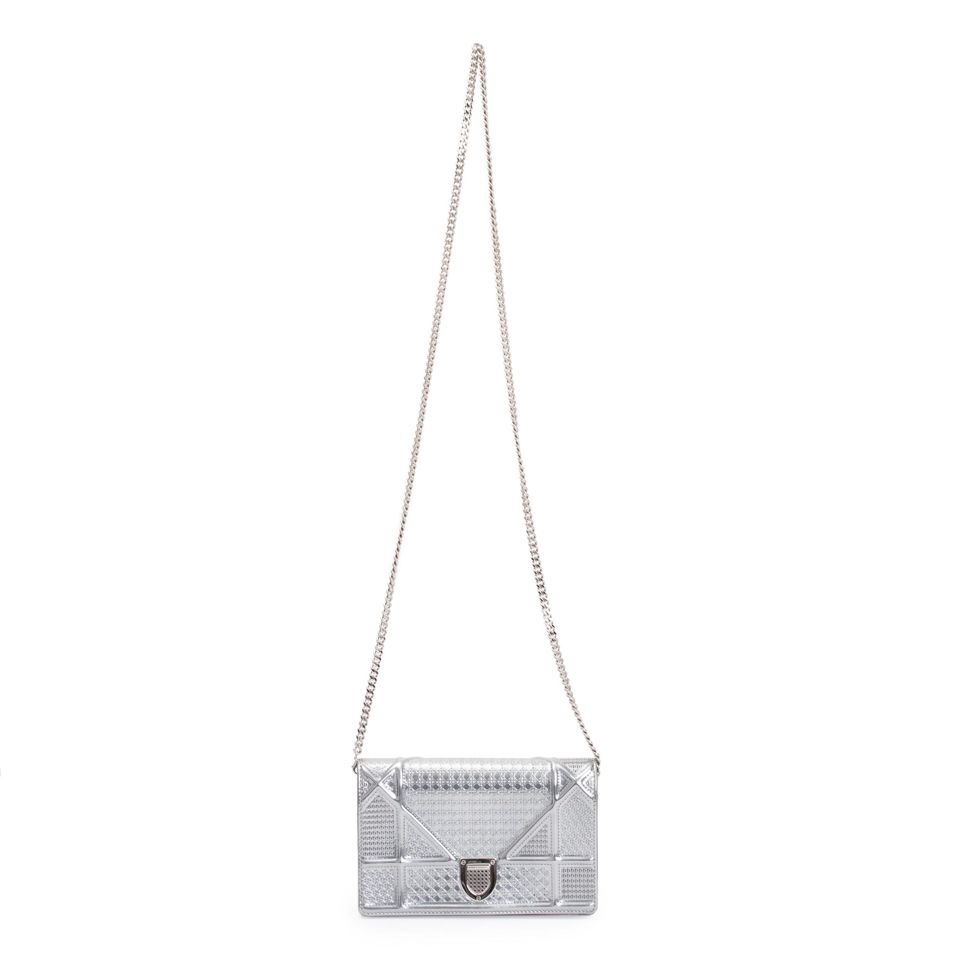 Christian Dior Metallic Silver Cannage Patent Leather Diorama Wallet on Chain