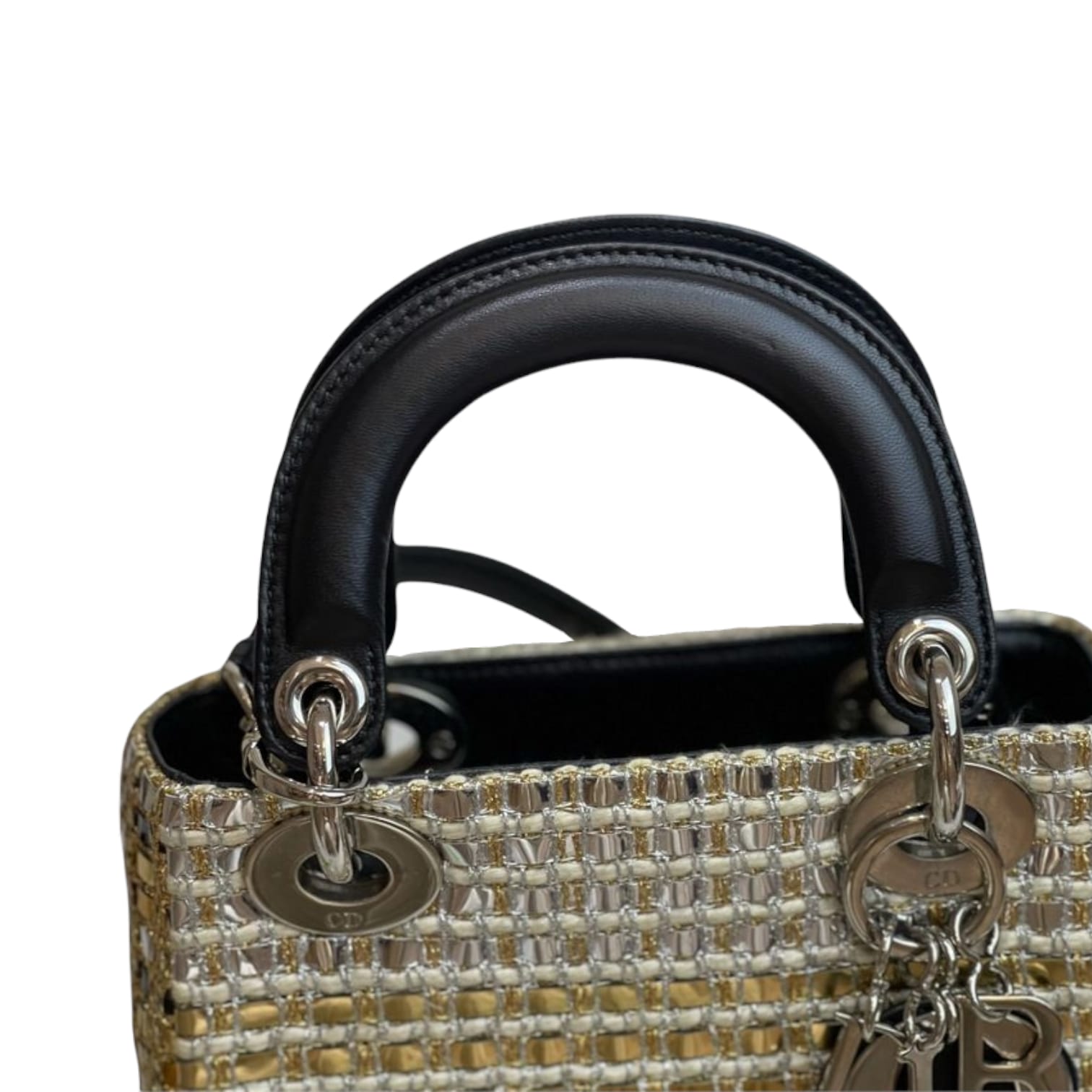 An elegant and modern take on the Mini Lady Dior. This stunning piece is a lovely combination of gold and silver braided into a tweed pattern. The silver signature D.I.O.R. metal jewelry charms embellish it with feminine elegance and the sturdy top handles with a long detachable chain make it versatile.