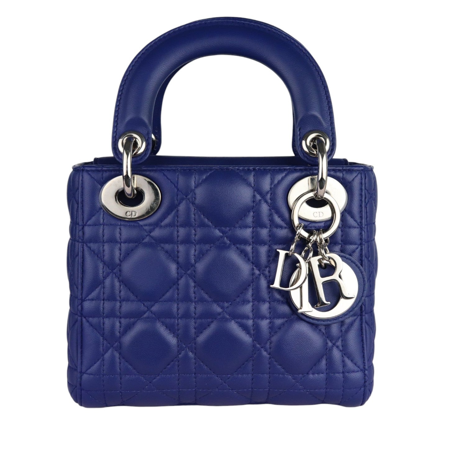 This Mini Lady Dior in blue lambskin leather and silver-toned hardware features the brand's iconic Cannage quilt that exudes classic femininity and elegance. With its detachable strap, you can easily transition from a handbag to a shoulder bag to a crossbody. The top flap opens to a fabric interior with a zipper pocket.