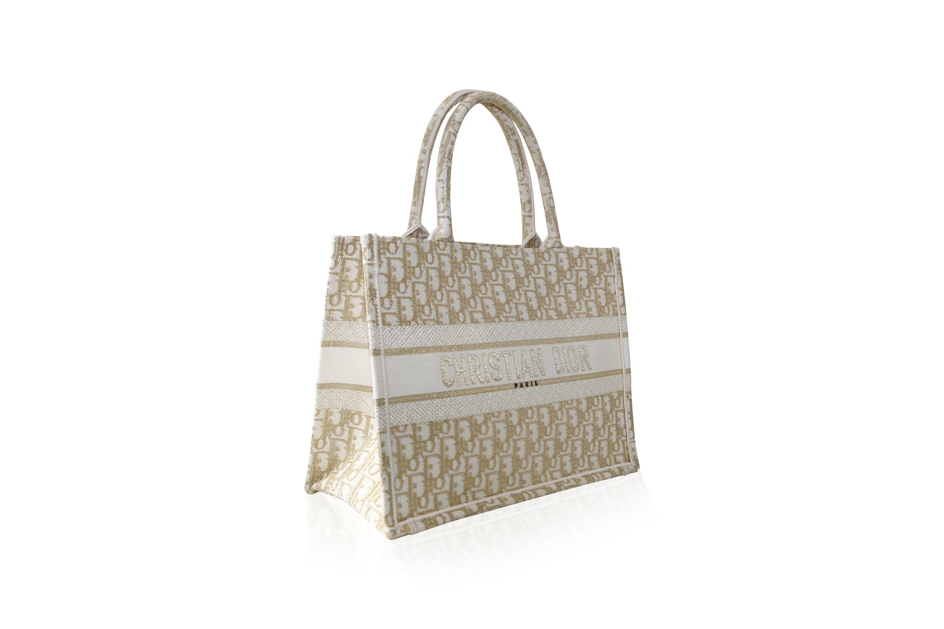 The medium tote features a white and gold-tone embroidered Dior Oblique motif and is embellished with the Christian Dior Paris signature on the front.