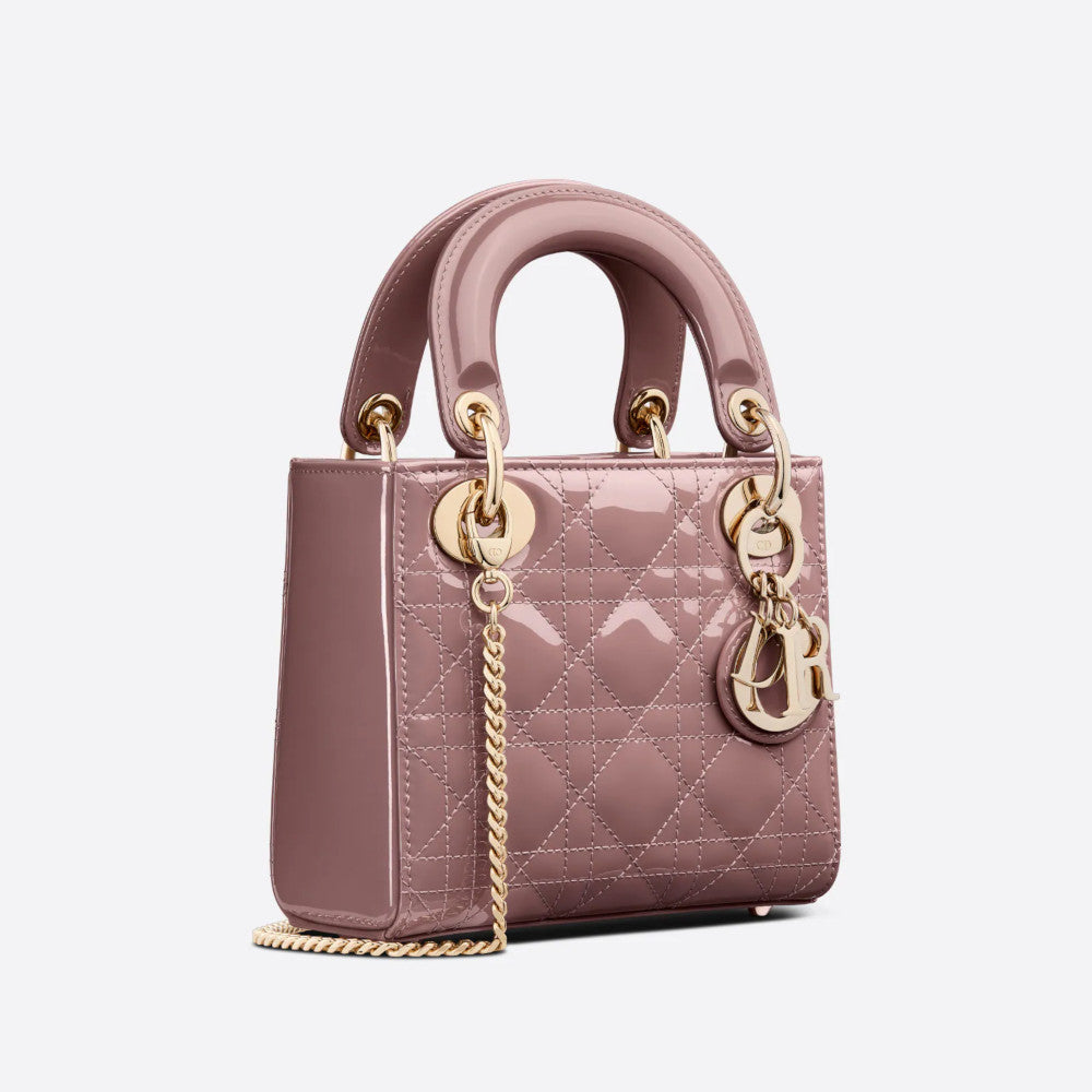 The Lady Dior handbag epitomizes the Ho 's vision of elegance and beauty. Refined and sleek, the timeless creation is crafted in patent calfskin and covered with Cannage stitching, creating an instantly recognizable quilted texture. The pale gold-finish metal D.I.O.R. charms embellish and illuminate its silhouette. Featuring a removable chain shoulder strap, the miniature Lady Dior bag can be carried by hand or worn crossbody as an ideal evening wear companion.