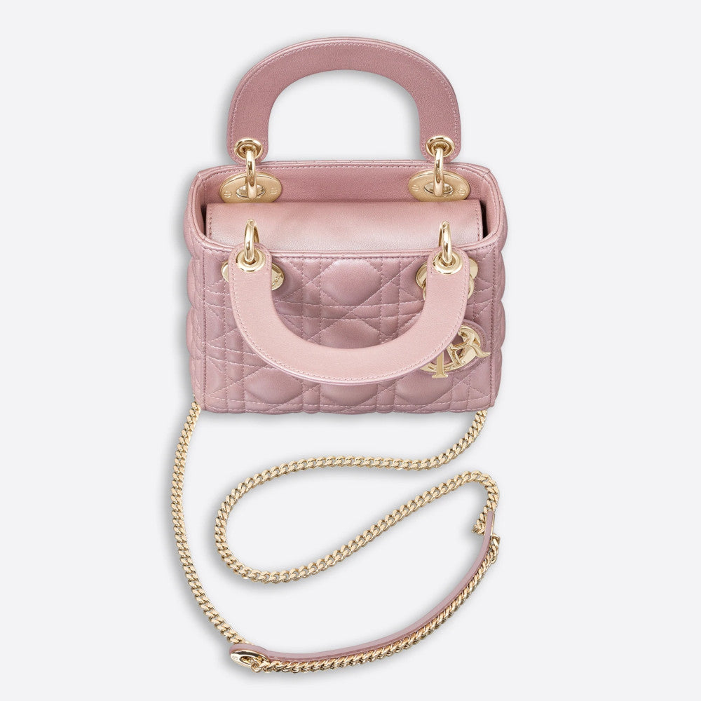 The Lady Dior handbag epitomizes the Ho 's vision of elegance and beauty. Refined and sleek, this creation is timeless. Crafted in opaline pearlescent lambskin with Cannage stitching, it boasts an instantly recognizable quilted texture. The pale gold-finish metal D.I.O.R. charms embellish and illuminate its silhouette. Featuring a removable chain shoulder strap, the miniature Lady Dior bag can be carried by hand or worn crossbody as an ideal evening wear companion.