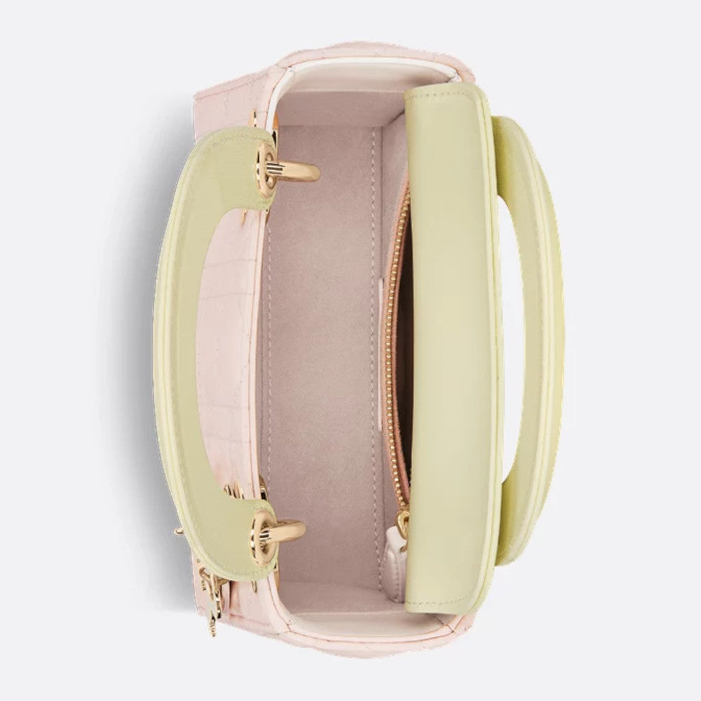The Lady Dior bag embodies the Maison's idea of elegance and beauty. This timelessly modern style in rose quartz and pastel yellow lambskin with cannage stitching is highly recognizable with its quilted structure. D.I.O.R. pendants with enamel matching the handles round off the silhouette in a glamorous way. The Lady Dior bag in mini format can be carried by hand and can also be as a shoulder or crossbody bag thanks to the detachable chain strap. Perfect for the evening.