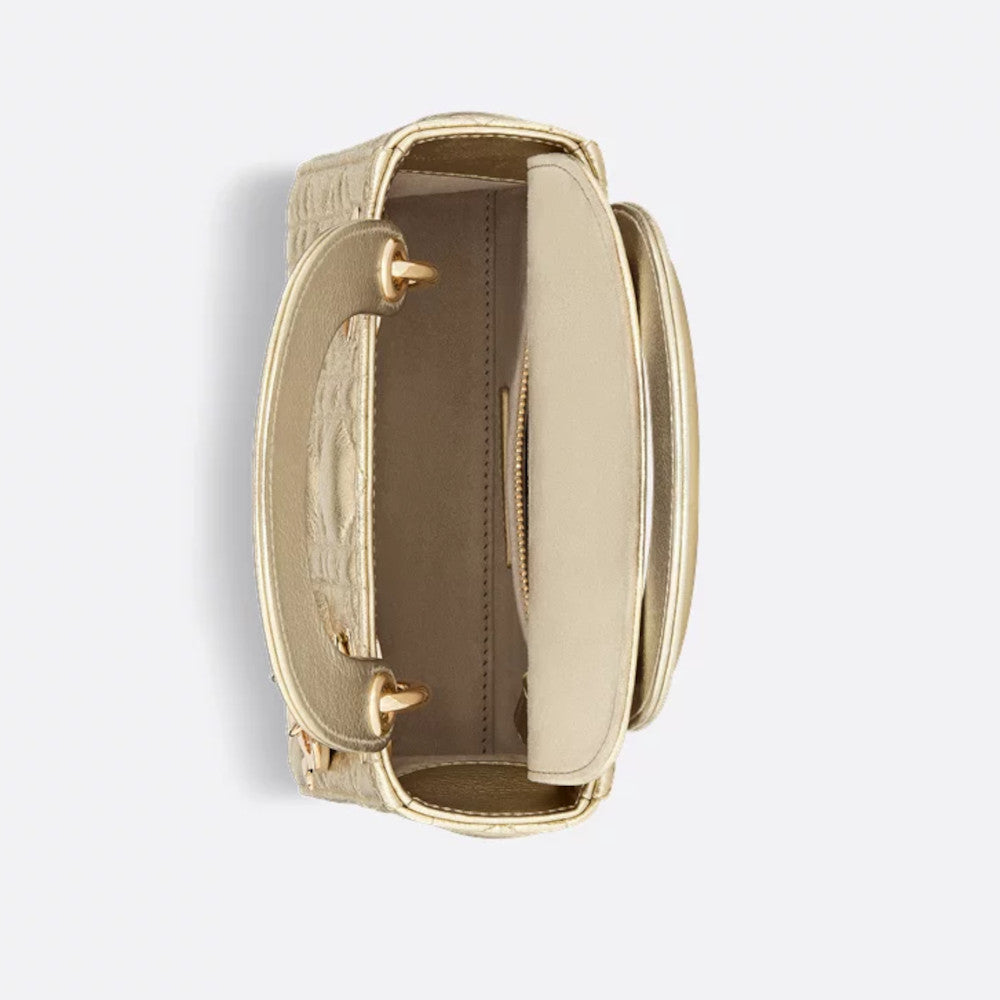 The Lady Dior bag embodies the Maison's idea of elegance and beauty. The elegant, timeless design made of calfskin in metallic gold color with Cannage decorative stitching ensures a high recognition value with its quilted structure. D.I.O.R. metal pendants with a light gold finish round off the silhouette in a glamorous way. The Lady Dior mini bag has a detachable chain strap and can be carried by hand or as a crossbody bag, perfect for the evening.