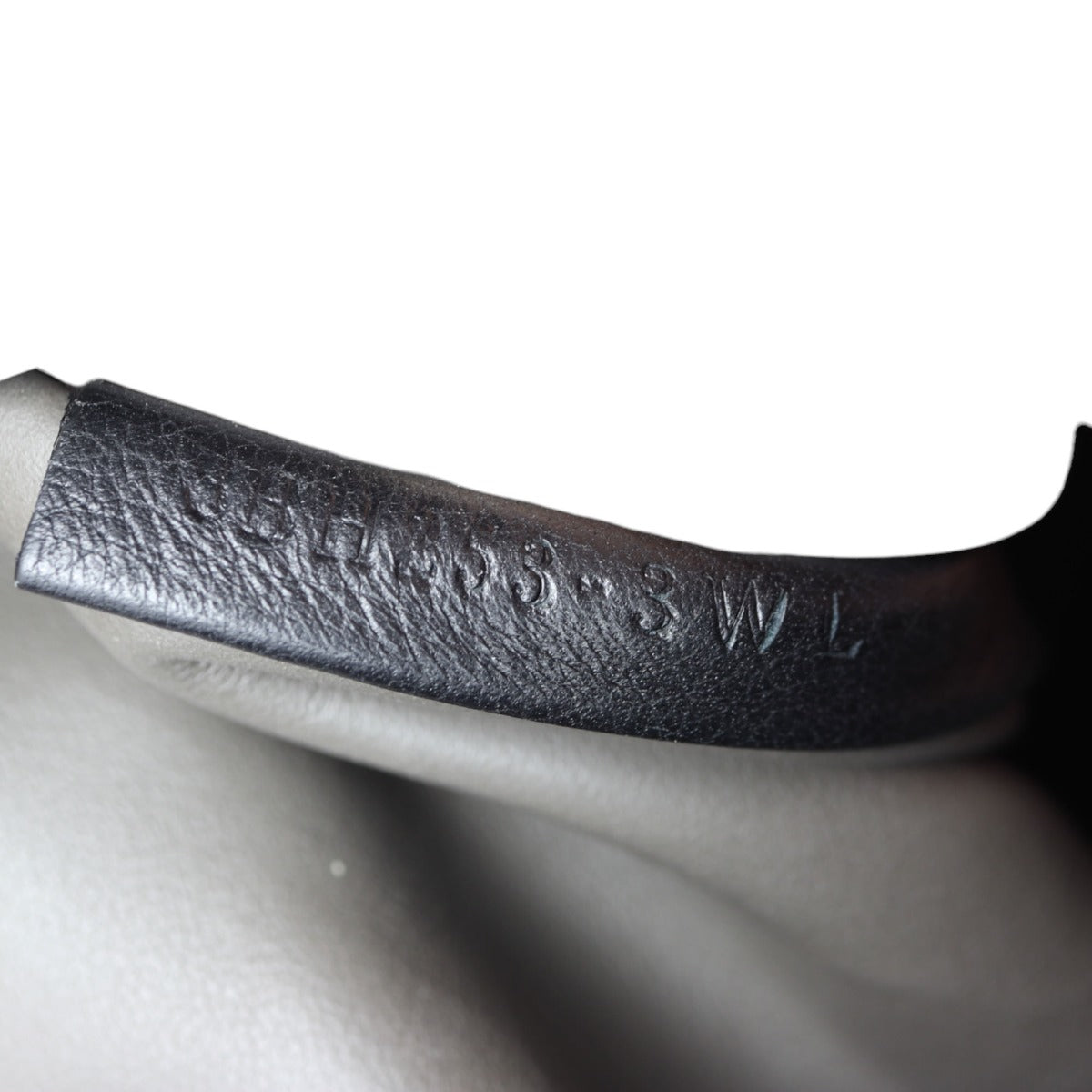 Features: Black textured calfskin leather exterior; double rolled top handles; detachable and adjustable shoulder strap; front exterior D-ring with removable hanging Fendi tag; gold tone hardware with black enamel fill; belted snap-lock closure to open main compartment; grey leather lined interior with central zipped compartment that divides the interior into two open sections.