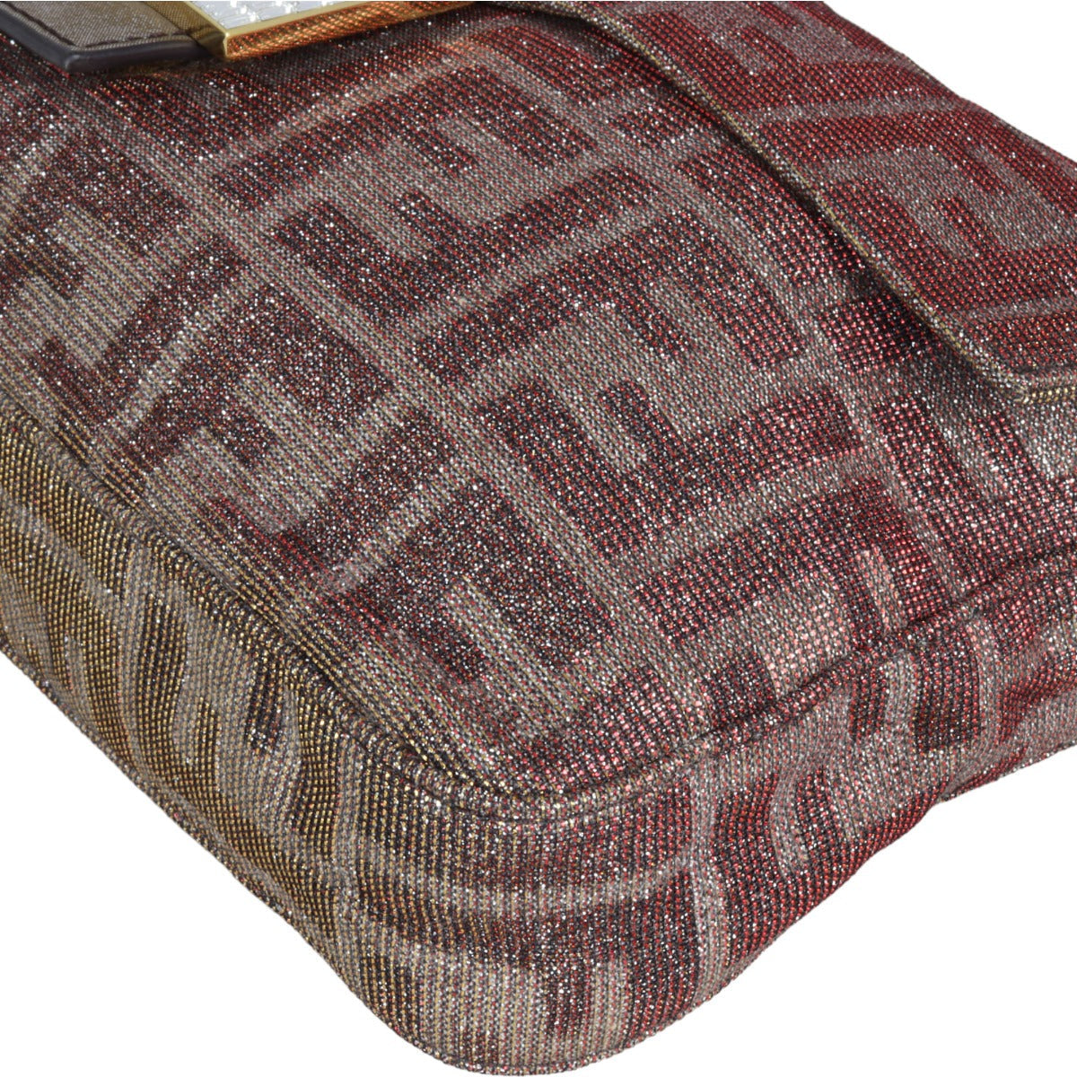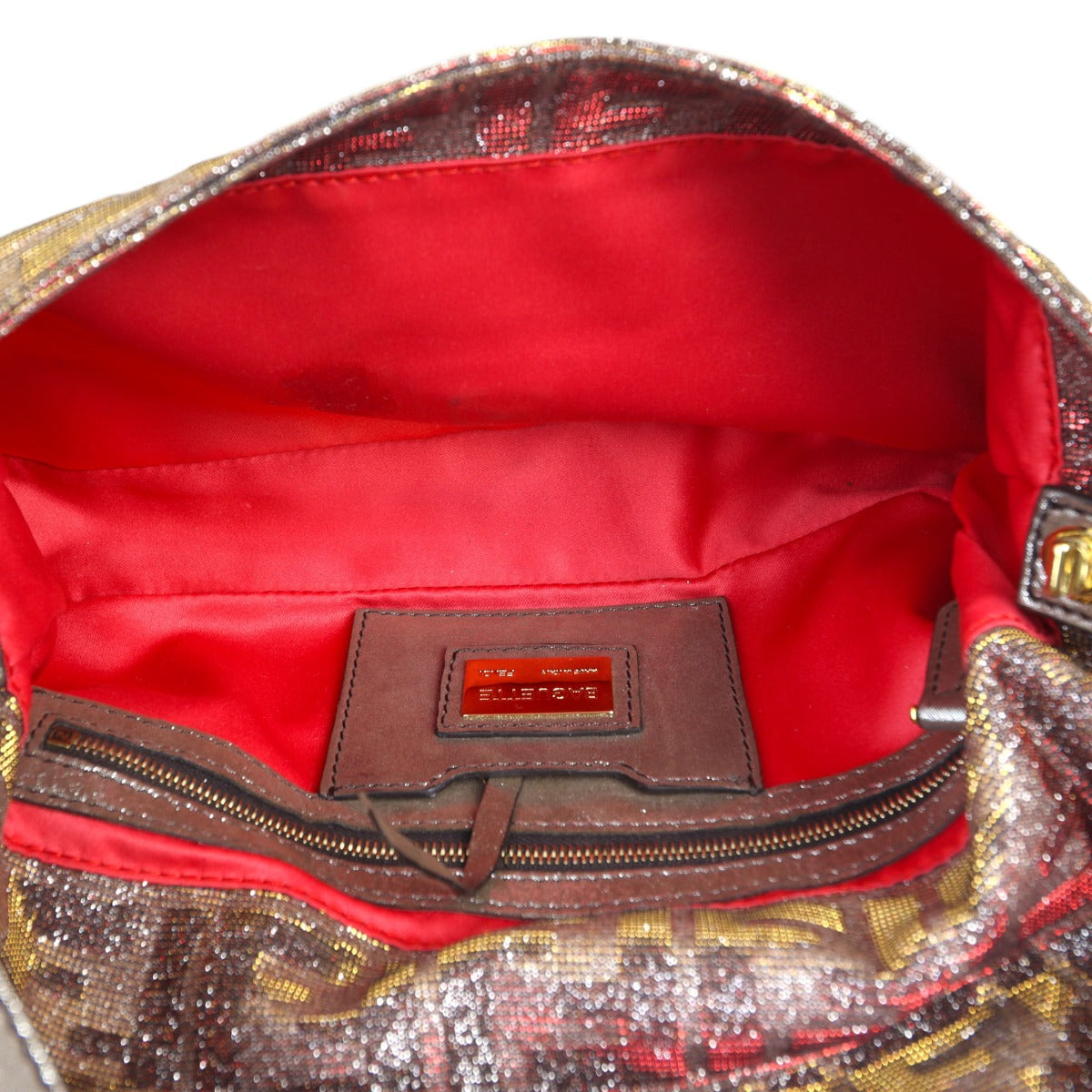 Features: Gold/red/brown glitter coated canvas exterior; detachable and adjustable top handle; gold tone hardware; front flap featuring crystal FF logo with magnetic snap closure; red satin lined interior with 1 x zipped pocket and 1 x slip pocket.