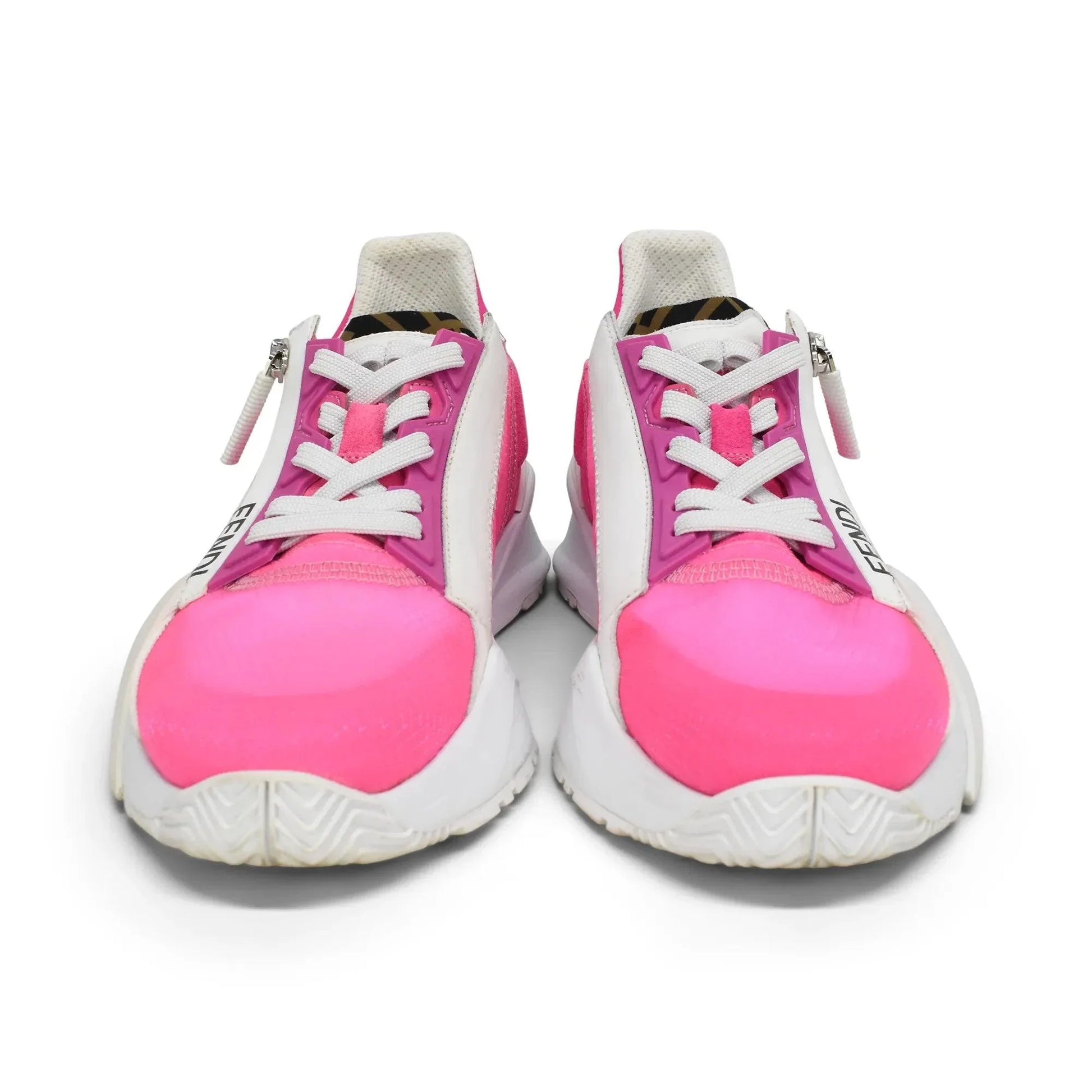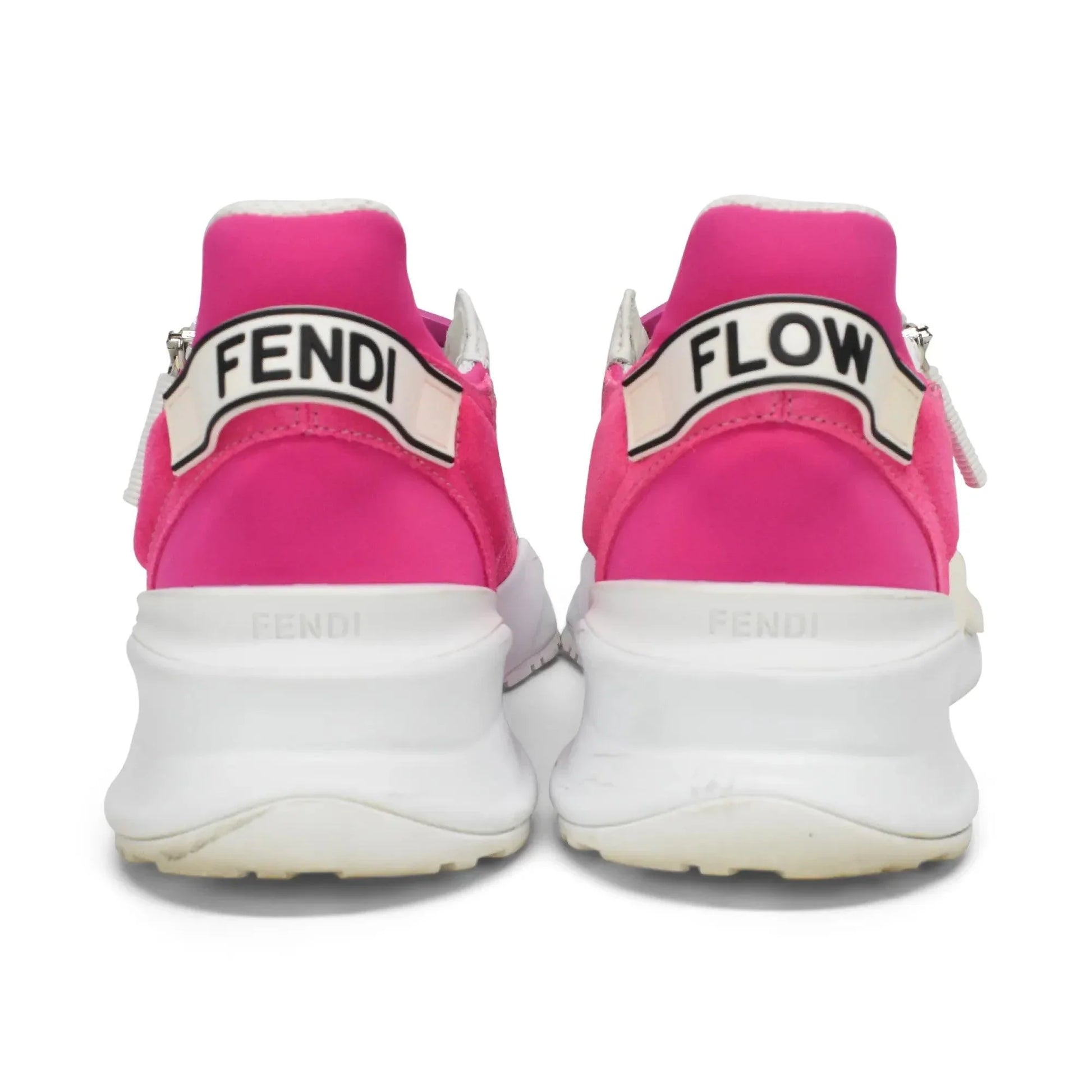 Fendi 'Flow' sneakers in bright pink with a white sole and white detailing throughout. Features a zipper on the outer sides in white with black logo, pink plastic lace eyelets, suede and neoprene panel details, a black and white rubber heel tab with 'Flow' on the back, and brown and black logo monogram trim on the tongue.Â