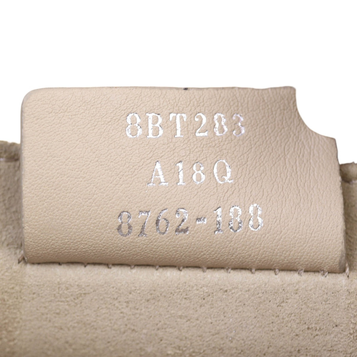 Features: Light grey smooth calfskin leather exterior with contrast sage green glazing; sliding chain shoulder strap with leather shoulder pad; detachable studded flat leather top handle; burgundy and white enamel with combination gold and silver tone stud details; silver tone hardware; top flap opening with push lock closure to main compartment; beige microfibre lined interior divided into two main sections with 1 x slip pocket.