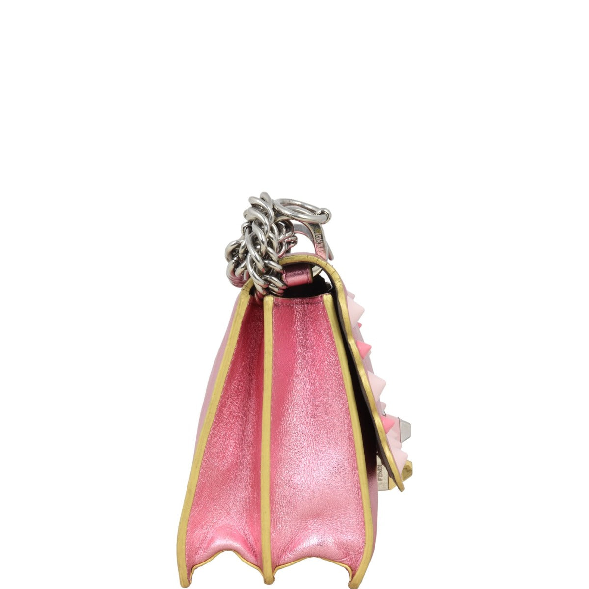 Features: Metallic pink calfskin leather exterior with gold glazing; sliding chain shoulder strap with leather shoulder pad; silver tone hardware; pink and baby pink enamel stud details; top flap opening with push lock closure; grey microfibre lined interior divided into two sections with 1 x slip pocket.