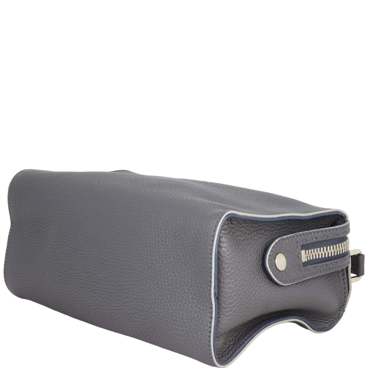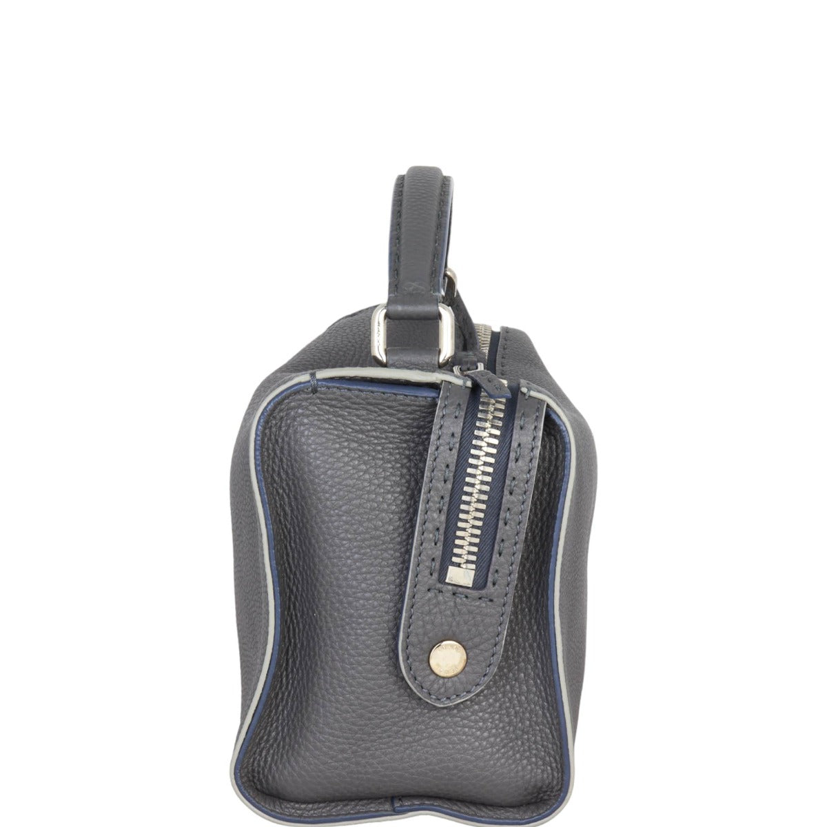 Features: Grey grained calfskin leather exterior; silver tone hardware; flat top handle; detachable hanging leather clochette with charm; detachable and adjustable shoulder strap; zip top opening to interior with zipped pocket and 2 x slip pockets.