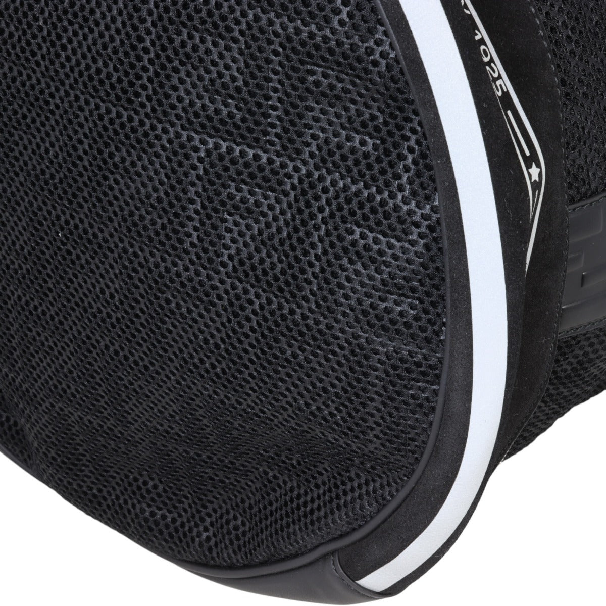 Features: Black mesh canvas with printed FF logo exterior; black FF embossed leather and smooth leather trim; silver tone hardware; suede base trim; 1 x exterior zip pocket; double zip around closure to base compartment; front zip opens to main compartment; detachable and adjustable wide web shoulder strap with leather shoulder pad; open top with drawstring closure to tonal nylon lined interior.