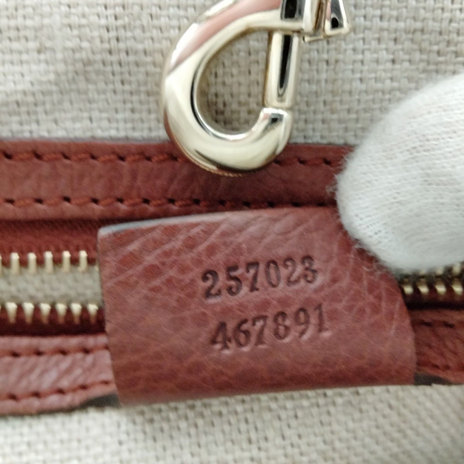 The purse is definitely a great example of Gucci's high-end bohemian look at its best! Inside, it has a very clean, ivory linen/canvas fabric lined interior with one main compartment, multiple slot, and one zip pocket inside. It has lots of room for everyday or special occasions! Inside, along the back edge above the zip close pocket, the purse has a leather tag embossed with 'Gucci, Made in Italy' on the front and embossed with the serial numbers 257023 457891 on the back- see pictures. The purse has been ated by a third party expert, so buy with confidence! Don't miss out!