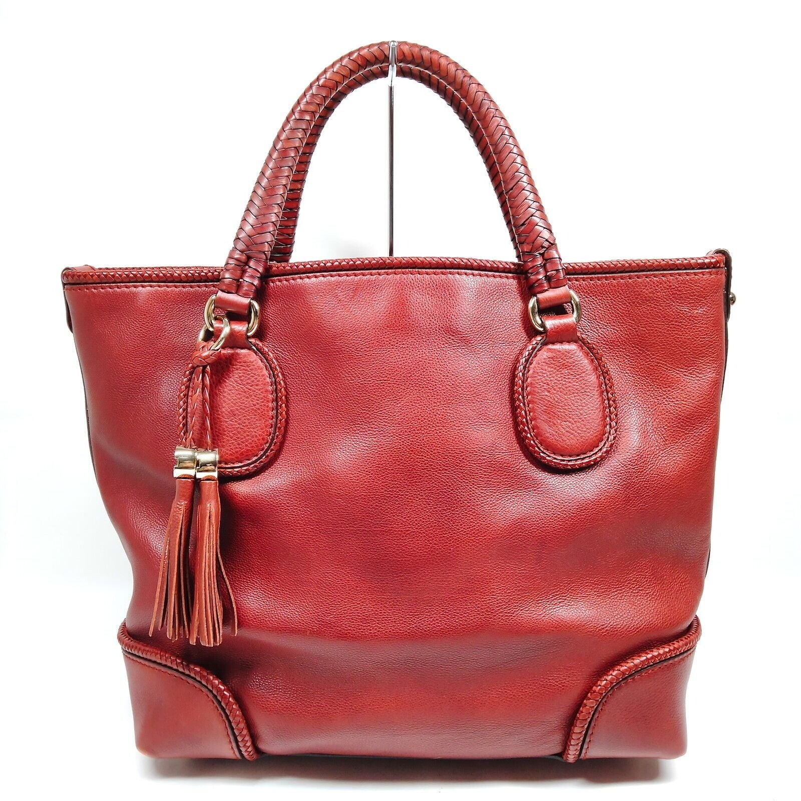 This is a fabulous, rare, hand-crafted, burgundy/ox blood leather, Marrakech style XL tote with gold GG accents & tassels! It has an open top with a pull latch hook to bring the sides together and a gold GG accent and tassel at the center. It has hardware accents in gold tone including at the center where there is a gold GG logo accent! The handles have whip-stitching/braiding that is obviously done by hand, too!