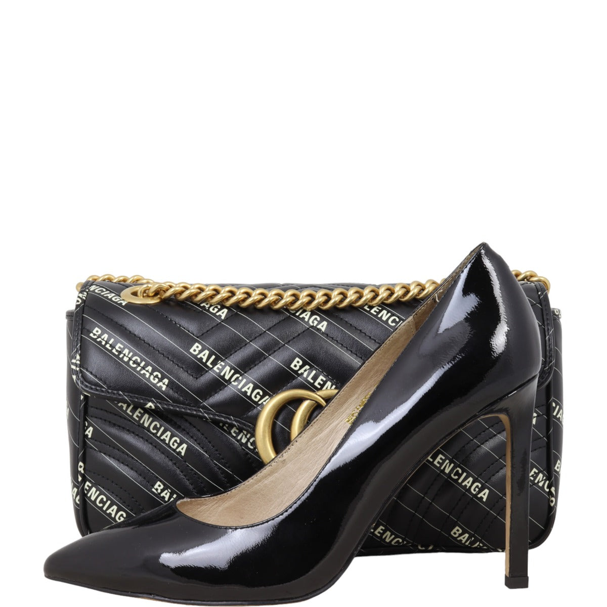 Features: Black matelassé chevron leather exterior; white Balenciaga printed logo; stitched heart on rear; gold tone hardware including double G hardware; sliding chain and leather shoulder strap; top flap with push-lock closure to main compartment; beige microfibre lined interior with 1 x zipped pocket.