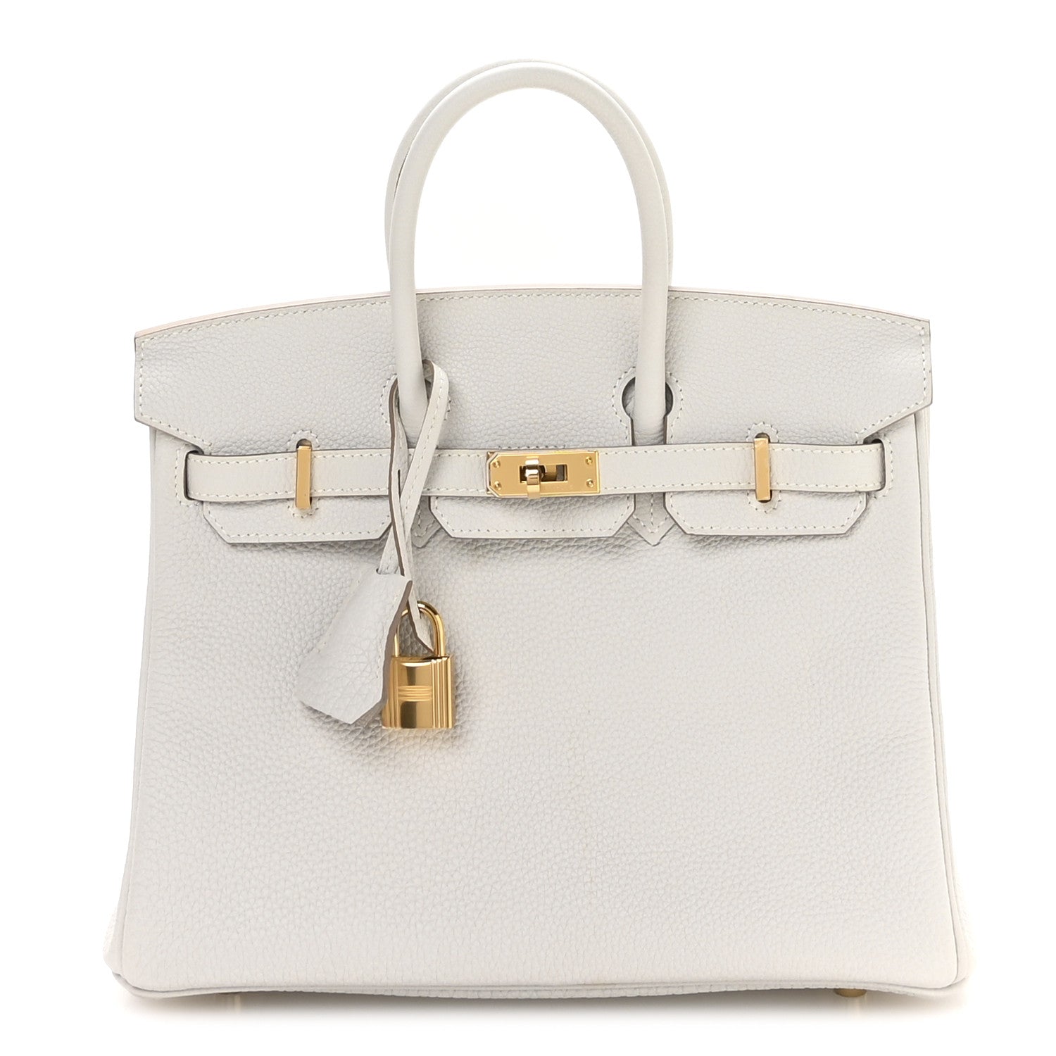 This is an HERMES Togo Birkin 25 in Gris Perle. This handbag is crafted of togo calfskin leather in light grey. The bag features rolled leather top handles, a short front flap and strap closure, and gold plated hardware including a turn lock and keys in the clochette. This opens to a goatskin leather interior with zipper and patch pockets.