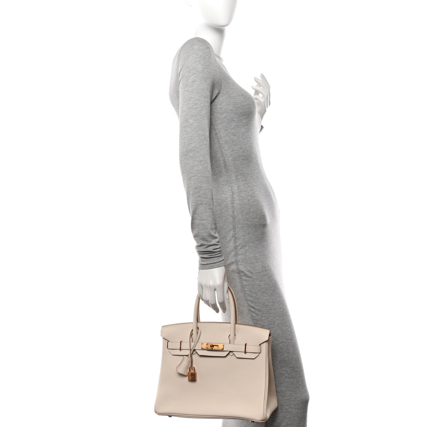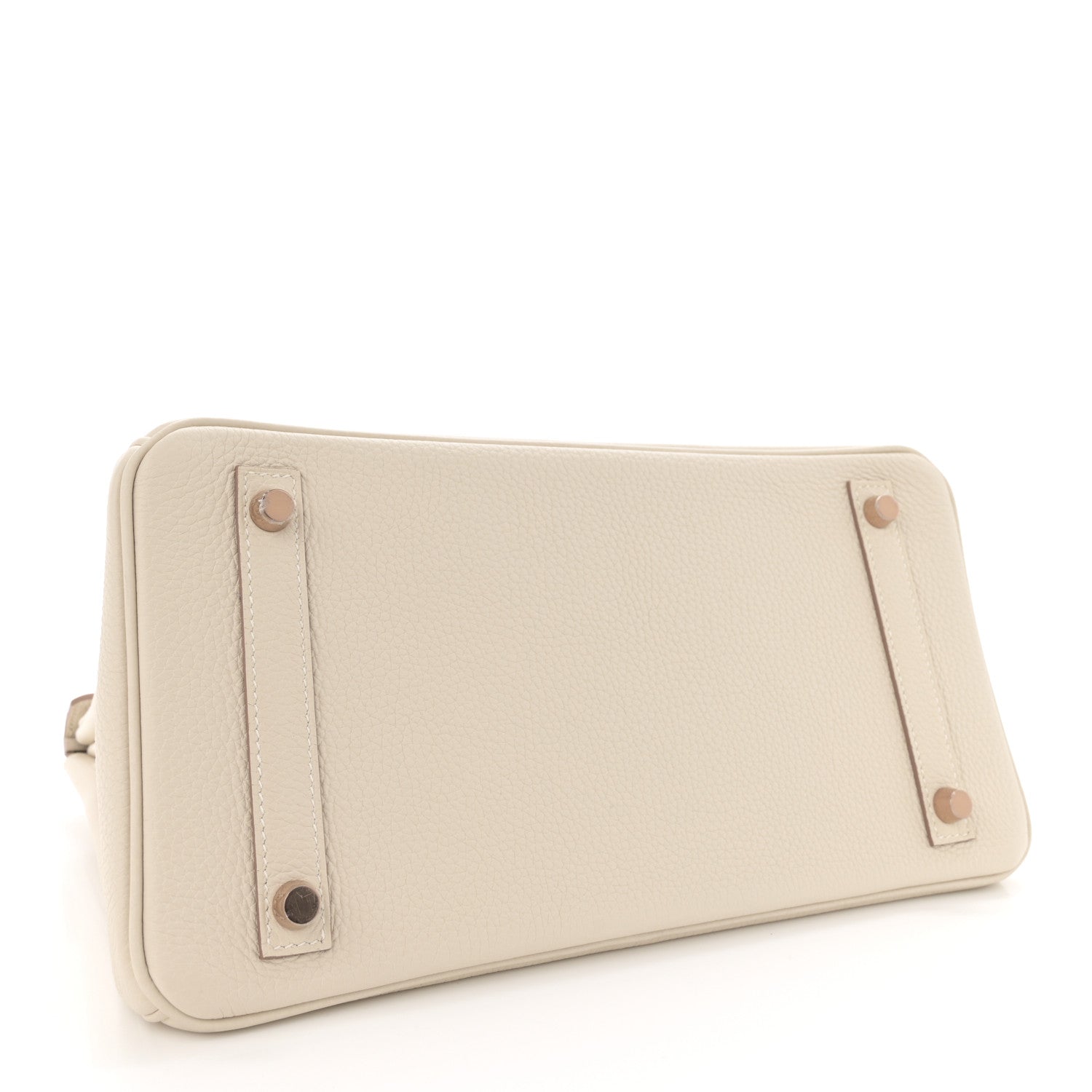 This is an HERMES Togo Birkin 30 in Craie. This classic handbag is crafted of textured leather in off-white. It features rolled leather top handles, a flap with strap closure, and gold plated hardware including a turn lock. The flap opens to a leather interior with zipper and patch pockets.