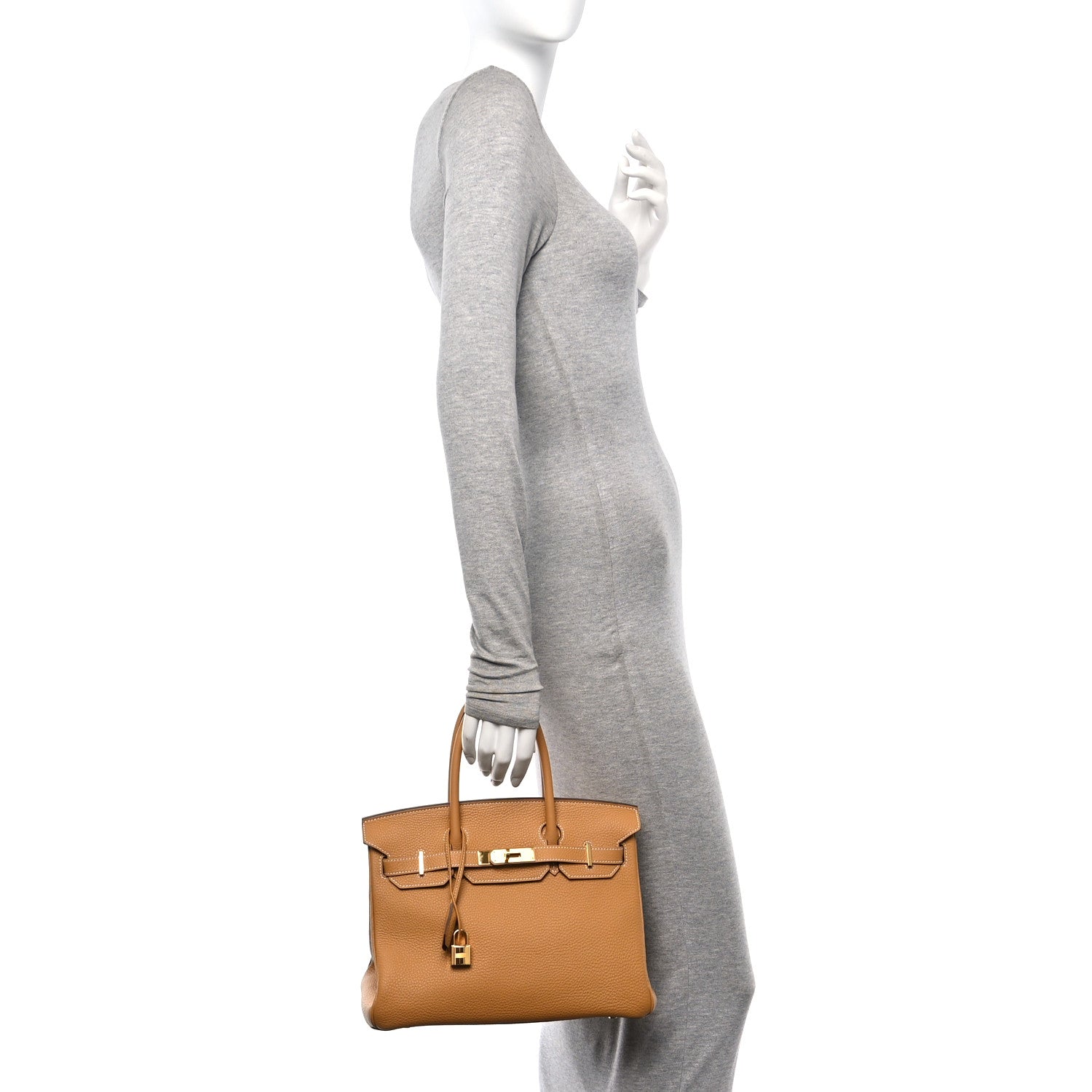 This is an HERMES Togo Birkin 30 in Natural Sable. This iconic handbag is finely crafted of grained golden brown calfskin leather. The bag features rolled leather top handles, a leather belt, and a gold-plated turn lock with a padlock and a hanging clochette for the keys. This opens to a matching leather interior with a zipper and patch pockets.